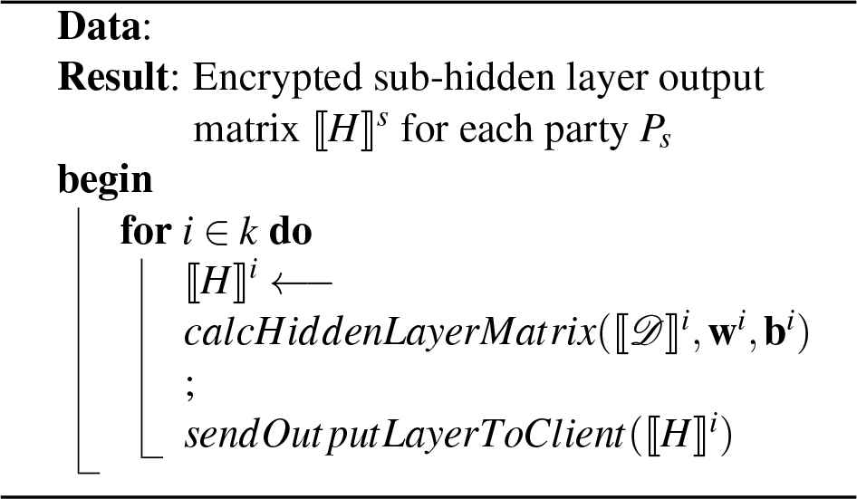 Algorithm 3 shows the calculation of the hidden layer output matrix for each server in the encrypted domain.