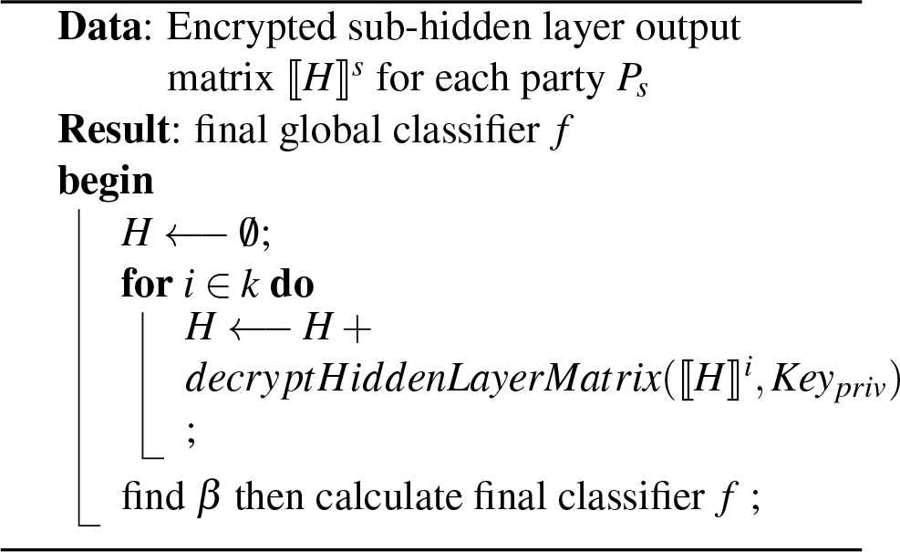 From Eq. 13, the computation of the hidden layer output matrix H can be distributed into k different parties by using the secure sum of matrices, such that:
