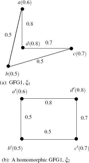 Let us consider a GFG1, ξ1 =(V2,ρ1,ω1) where V1 = {a(0.6), b(0.5), c(0.7), d(0.8)} and edge set {((a,b),0.5), ((b,c),0.5), ((c,d),0.7), ((d,a),0.8)} which is shown in Fig. 3(a). Also, let another GFG1, ξ2 = (V2,ρ2,ω2) V2 = {a′ (0.6), b′ (0.5), c′ (0.7), d′ (0.8)} and edge set {((a′,b′),0.5), ((b′,c′),0.5), ((c′, d′),0.7), ((d′,a′),0.8)}. Also, let h : V1 → V2 such that h(a) = a′, h(b) = b′, h(c) = c′, h(d) = d′. θ1(x) = x and θ2(y) = y. Then, by routine calculation, it is observed that the graphs are weak isomorphic.