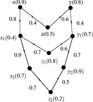 In Fig. 1, neighbourhood of x is {(y,0.9),(z,0.5),(t,0.8)}. In the same figure, the out-neighbourhood of x is the set {(y,0.2),(z,0.2)} and in-neighbourhood of x is (t,0.2).