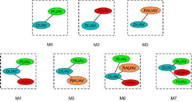 Through observation and study of UAV operational networks, we have identified 7 types of significant motifs that appear with frequency. Fig. 1 depicts our groupings.