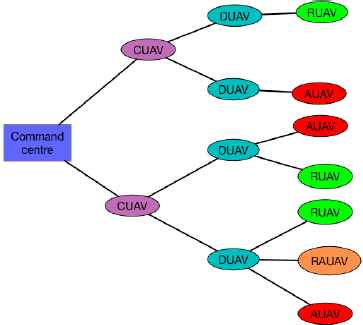 Restrictions in bandwidth and communication distance limit the operation range of UAV swarms. CUAVs have wide bandwidth and long distance communication abilities. We use a CUAV to connect motifs performing the same task. Specifically, CUAVs connect to DUAVs in motifs. CUAVs are responsible for transmission of commands and the collection of battlefield information. Fig. 3 shows the communication structure in our model.
