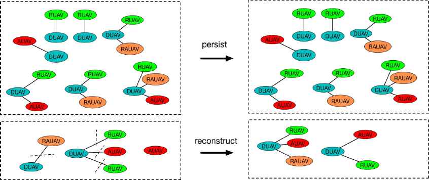 In the future, we plan to use an optimization algorithm to minimize the number of altered connections during the reconfiguration process. Furthermore, we would like to study the relation between the percentage of UAVs and the scheme evaluation indexes through setting contrastive experiments. In addition, we would take war loss of UAVs into consideration. We will find appropriate functions to represent the war loss of UAVs. We will replace fixed numbers with UAV number functions to indicate numbers of each type of UAVs in MDLS algorithm.