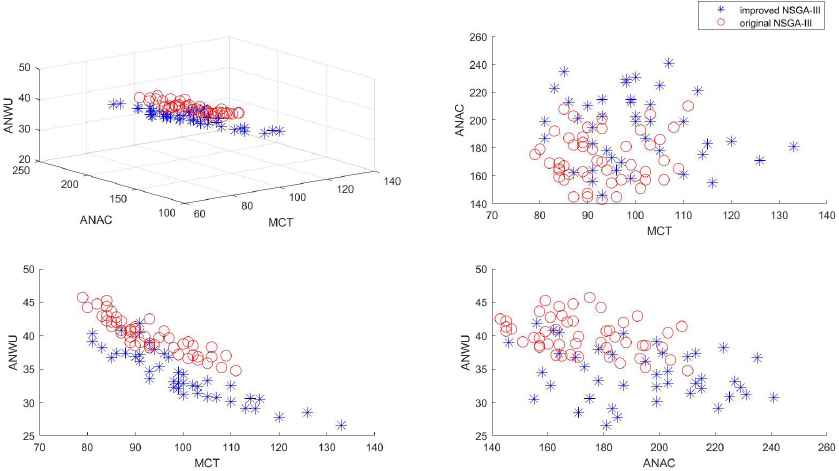We applied both the improved and original algorithms to solve this problem. Figs. 10 provides the 3D and 2D results of the last generation got by two algorithms. Red circles represent the last generation obtained from the original NSGA-III algorithm.