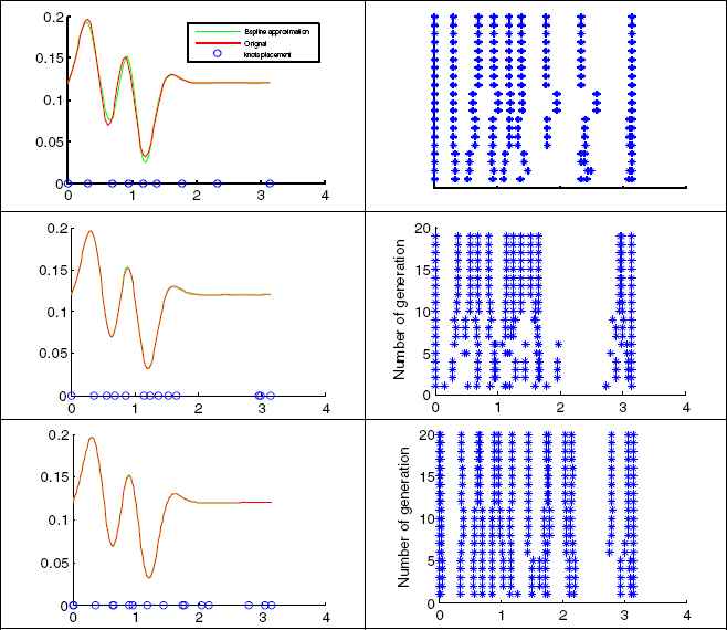 Approximating spline vs. actual function f1(x) (left) at final generation and distribution of knots in each generation (right) for 2, 4 and 6 interior knots respectively