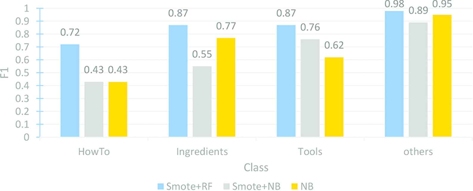 The experimental result show that applying SMOTE with Random Forest provides the best performance compared to other algorithms (see Fig. 3 and Table 6). We found that F1 score obtained from SMOTE + RF is 0.87 for Ingredients and Cooking tools class. For How-to class, F1 score obtained from SMOTE + RF is 0.72 which is higher than that of SMOTE + NB and NB algorithm. We found that for imbalanced dataset using synthetic oversampling method with ensemble can enhance the classification performance. SMOTE + NB cannot improve the precision value for every class.