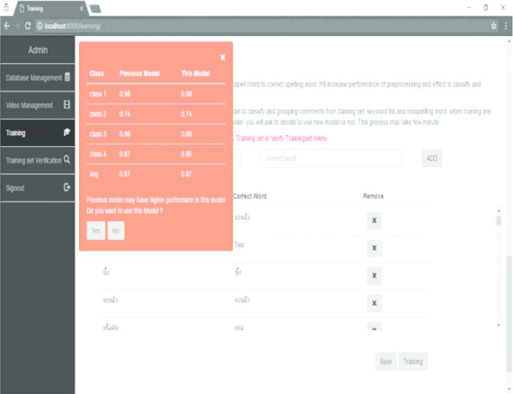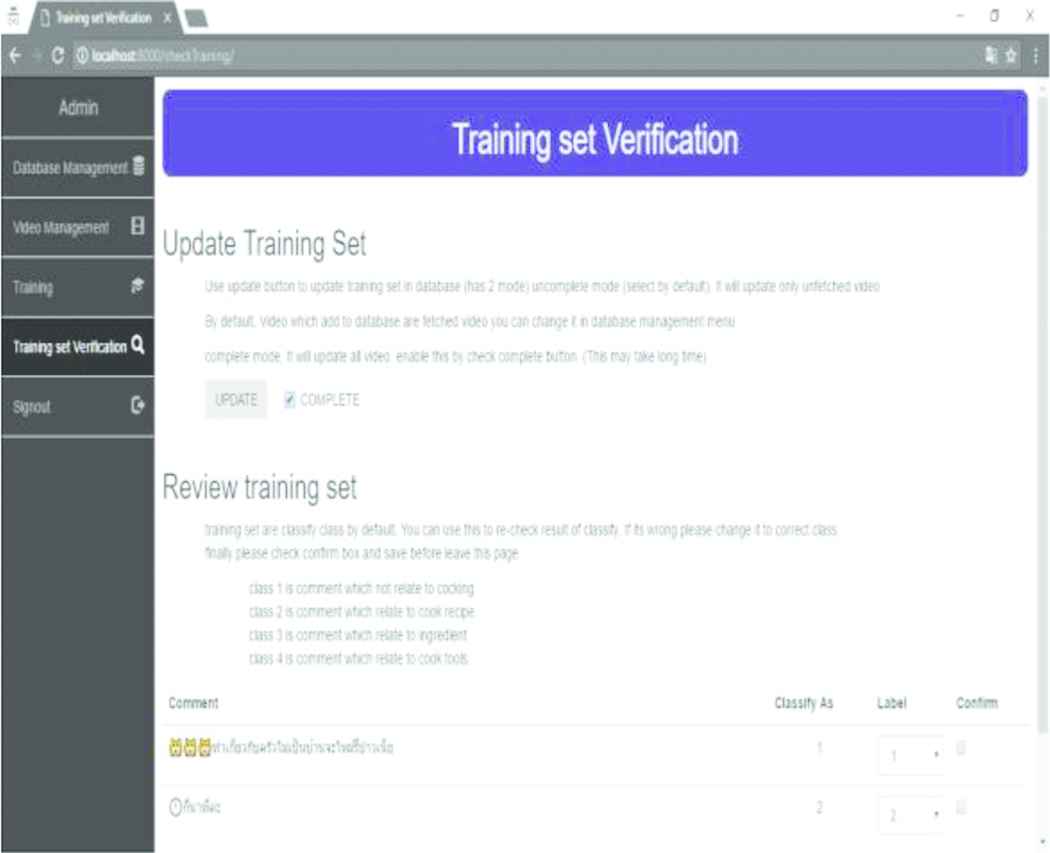 The framework is implemented as the comment management system based on cooking video clips. The system provides options for the user to update the learning model in incremental style.