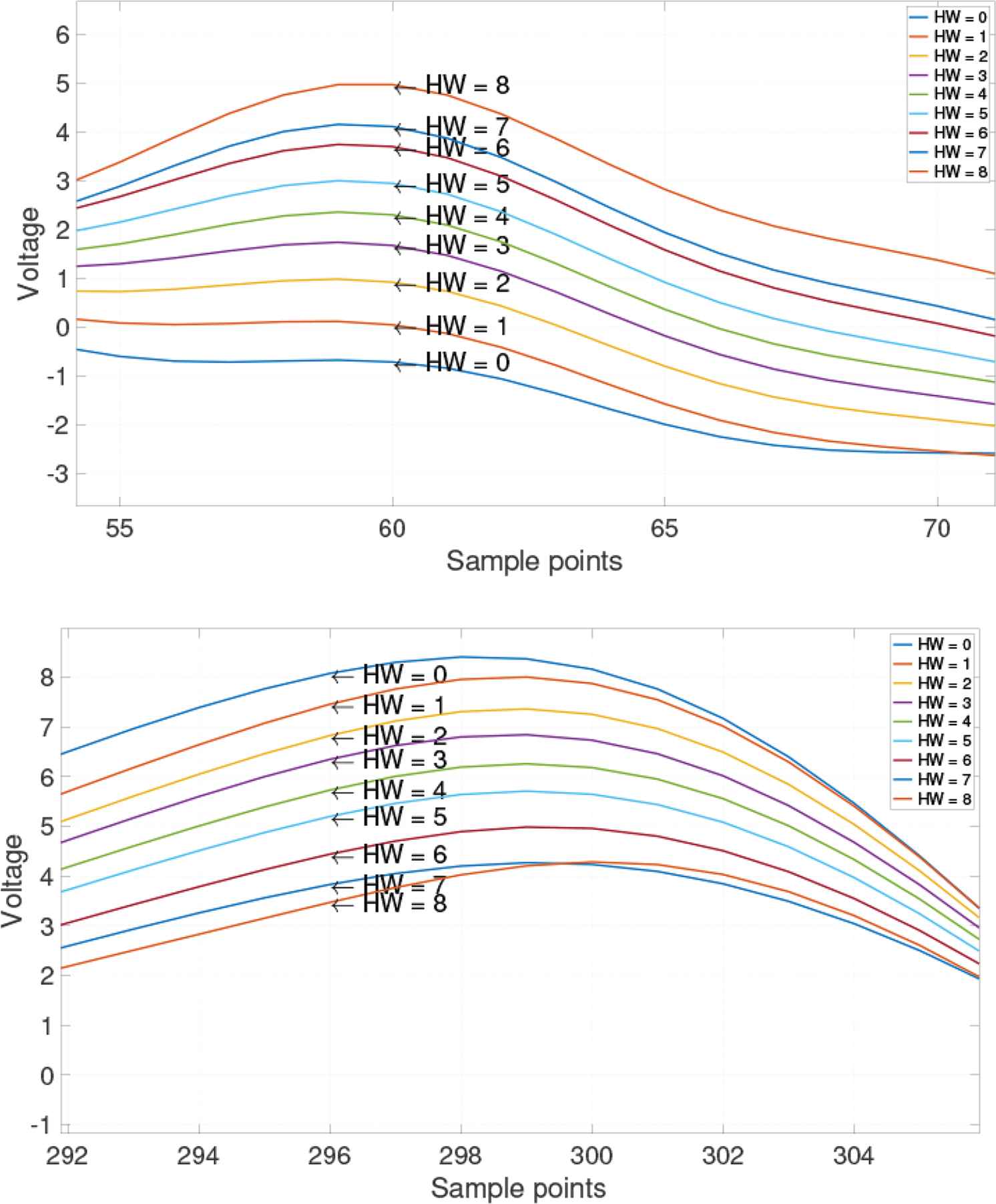 When viewed at a higher resolution, it is obvious from Figure 2 that the trace for voltage consumption at the trace for HW = 8 is greater than that at HW = 0 at the 60th sample point; however, this may not hold true for all observations. In contrast, at the 296th sample point, an entirely opposite trend is observed for the consumptions.