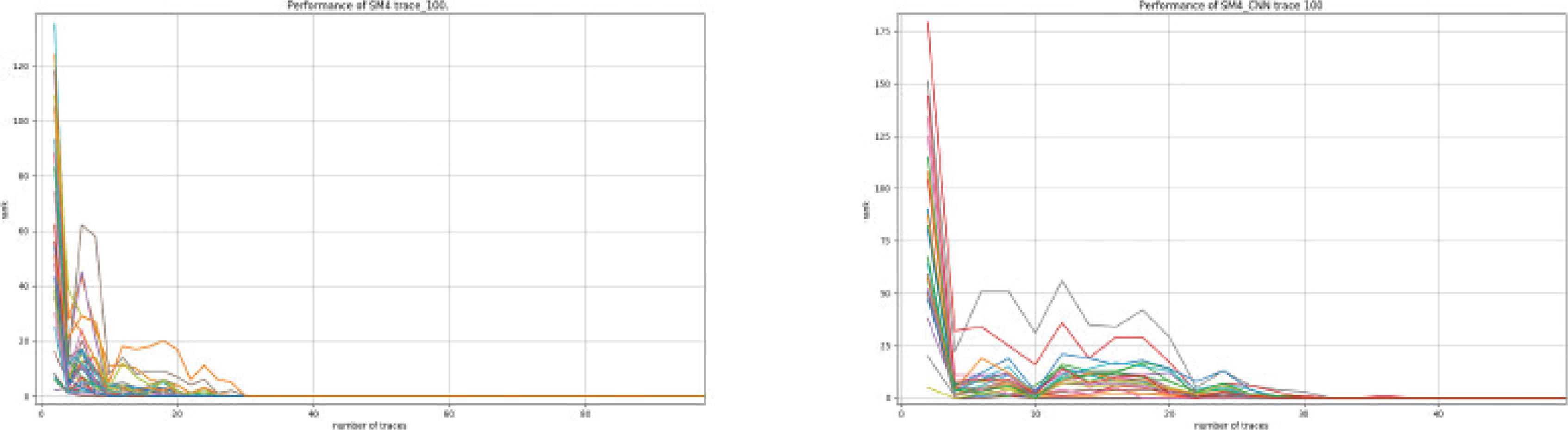 The traces in SM4 dataset is shown in Figure 2. Some statements in the SM4 code worsens the leakage, which is due to the large HWs at some sample points. The classification results for SM4 are much better than those for ASCAD. Figure 18 shows the classification results for SM4 using MLP and CNN. It can be seen that about 30 traces are required for the two models to make rank equal to 0. Moreover, when rank is not equal to 0, its value tends to fluctuate with increasing number of traces.
