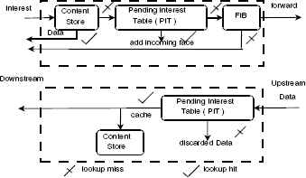 The consumer specifies its request by forming an interest packet containing the name of the data. On receiving the interest packet, the router first checks its CS. If the data packet corresponding to the interest packet is present in CS then it is forwarded back to the consumer, else the name in the interest packet is checked in the PIT. If a matching entry is found in the PIT then the incoming interface of the interest packet is appended to the PIT entry, else a lookup is performed in the FIB table. The FIB decides the outgoing interface on the basis of the longest prefix match, and a new entry for the interest packet is created in the PIT. If there is no match found in FIB, then the router sends either drop the interest packet or send a negative acknowledgment back to the sender depending upon the router’s policy.