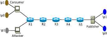 For performing the attack, we have considered linear topology as shown in Fig. 2. The attacker and the consumer are attached to R1, and the producer is attached to R5. The attacker wants to check whether consumer recently requested privacy sensitive content published by the publisher who is publishing content for prefix “/prefix.”