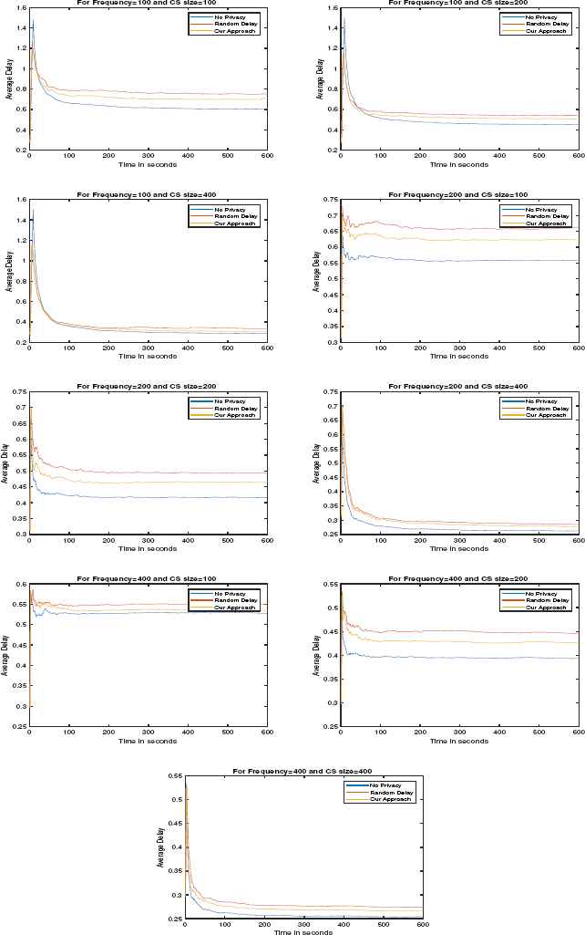 Fig. 5 and Fig. 6 show the performance of our countermeasure as frequency and CS size changes in case of uniform random delay and exponential random delay respectively. For the evaluation of our approach, we have chosen the average delay of all the flows in the network per second. As we increase the frequency of the consumer, the rate of arrival of the data packets also increases which leads to the decrement of CT. The value of CT increases with the increase in the size of CS as shown in Table 2. We can also observe the decrease in average delay as the size of CS is increased and the increase in average delay as the frequency increases. We can also observe that the best performance is achieved when no privacy is applied, this is the upper bound of the performance of the CS, but it does not have any privacy. In the random delay approach, the attacker would not be able to decide whether a request is served from the cache or by the producer, but the performance still degrades considerably. Our approach is better than the random delay approach.