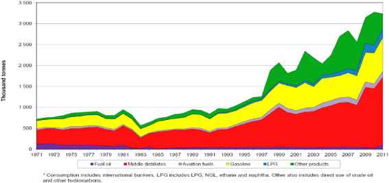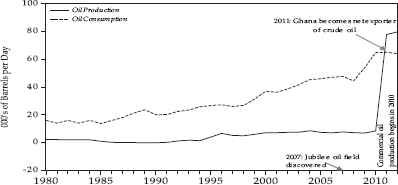 Ghana achieved lower middle income status in 2006 after a rebasing of the national accounts. With a chequered economic history characterized by a series of fluctuating revenue inflows and losses from commodity exports (mainly gold, cocoa and timber), Ghana has since the last two decades posted considerable growth rates. Real gross domestic product (GDP) growth has hovered around 5% since 2003, hitting an all-time high of 15% in 2011. The rapid growth of the economy might imply increase demand for energy, especially crude oil. Ghana has traditionally been a net importer of crude oil, the price of which is determined on the international market. As a small and open economy, Ghana is often vulnerable to oil price shocks in the event of any significant price fluctuations. Total domestic oil consumption continues to rise while production has remained largely constant from 1980 until 2010 when commercial production came on-stream. Consequently, domestic production surged significantly from almost 9000 barrels a day in 2010 to about 80,000 barrels by 2012. From 16,000 barrels per day in 1980, crude oil consumption stood at 64,000 barrels per day in 2012 (see Figs. 1 and 2). In 2009 and 2010 alone, crude oil consumption grew by about 21.4% and 20.2%, respectively.