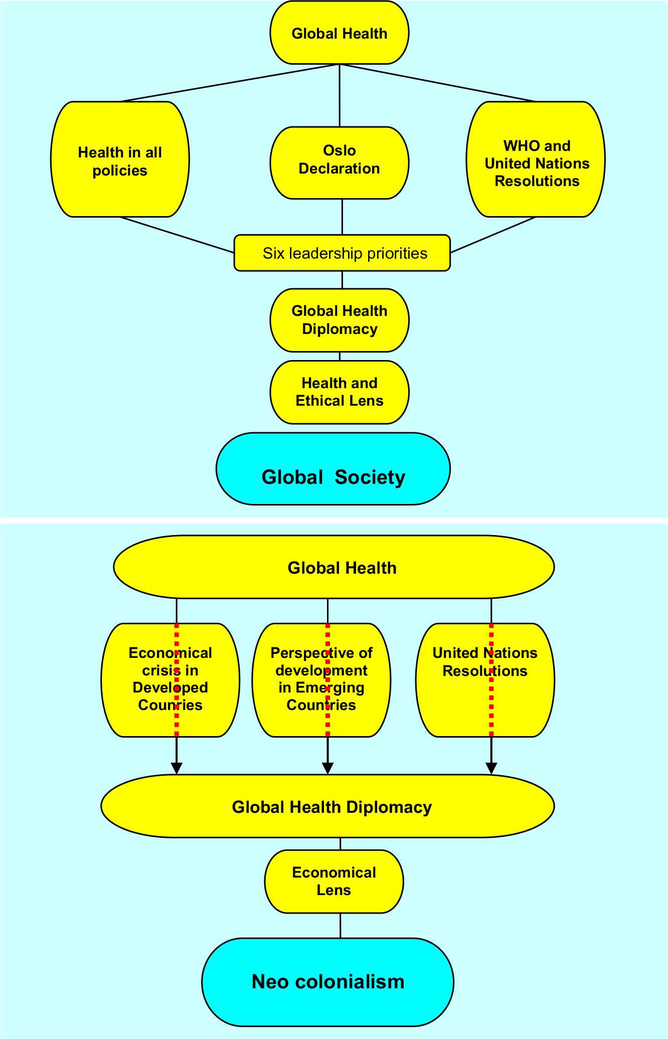 a) Scenario Global Society. The evolution of the meaning of Global Health produces documents that lead to the Global Health Diplomacy by passing through the six leadership priorities: this uses the “Health and ethical Lens” to give life to the Global Society. b) Scenario Neocolonialism, The Global Health passing through the global economic events (crisis and growth prospects and the documents of the UN) gives birth to a Global Health Diplomacy that uses the “Economical Lens” to give body to neocolonial actions.