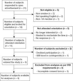 After initial screening over the telephone, participants attended an orientation meeting where the study process was explained and any questions or queries were answered. Those who agreed to participate at this point were asked to sign the consent form. The operation of the Tablet computer, loaded with ECA-Q, was demonstrated to each participant before dispatching the Tablet to the participant. A follow-up assessment after participants had used the ECA-Q for 14 days was conducted. Each participant was given a small subject fee ($40) as an incentive to actively participate in the study, which was given after completion of the follow-up interview and after returning the Tablet computer. This fee is comparable to other similar studies involving VA population. Participants were not required to use the Tablet daily to receive the incentives. As shown in Fig. 1, 21 subjects responded to the open advertisement, of which 11 subjects attended the orientation, and nine then entered the study and attended the follow-up after 14 days of ECA-Q use. However, consent forms for three participants were incomplete, which was reported to the VA IRB as soon as it was identified. The committee of VA IRB decided that the data for these three subjects must be excluded from the analyses. Thus, the remaining six subjects were considered as participants in the study and was included in the analyses.