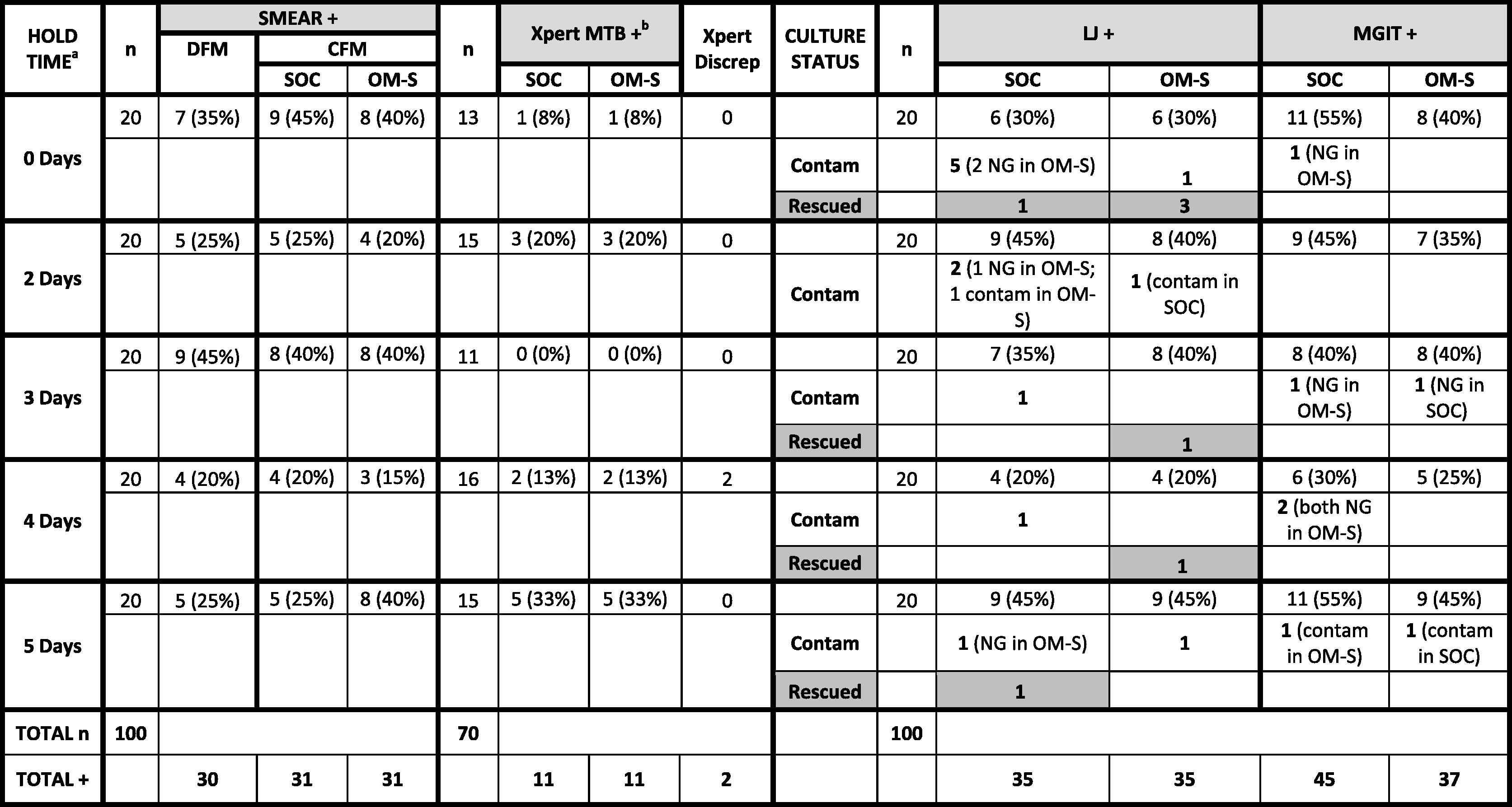 | Hold time (days)a | CFM Smear | Xpert MTB | LJ | MGIT | ||||