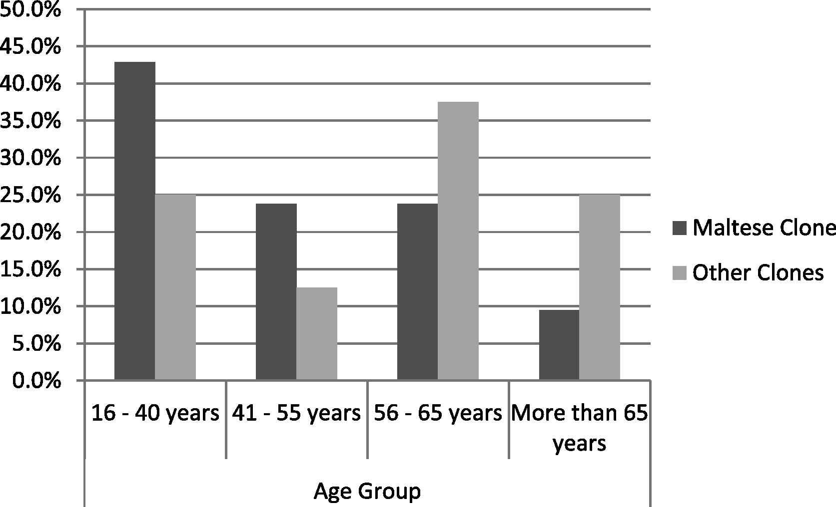 When MRSA carriers were grouped according to strain type, no significant difference was observed between genders. The Maltese clone was predominant in the younger age groups (16–40 years; Fig. 1) and in individuals with more than three risk factors, while the other clones were more prevalent in older individuals (>56 years) and in those with two risk factors for carriage. The z-ratio for the significance of the difference between two independent proportions showed a statistically significant difference in the proportion of colonization with the Maltese clone between the age groups of 16–40 and >56 years.