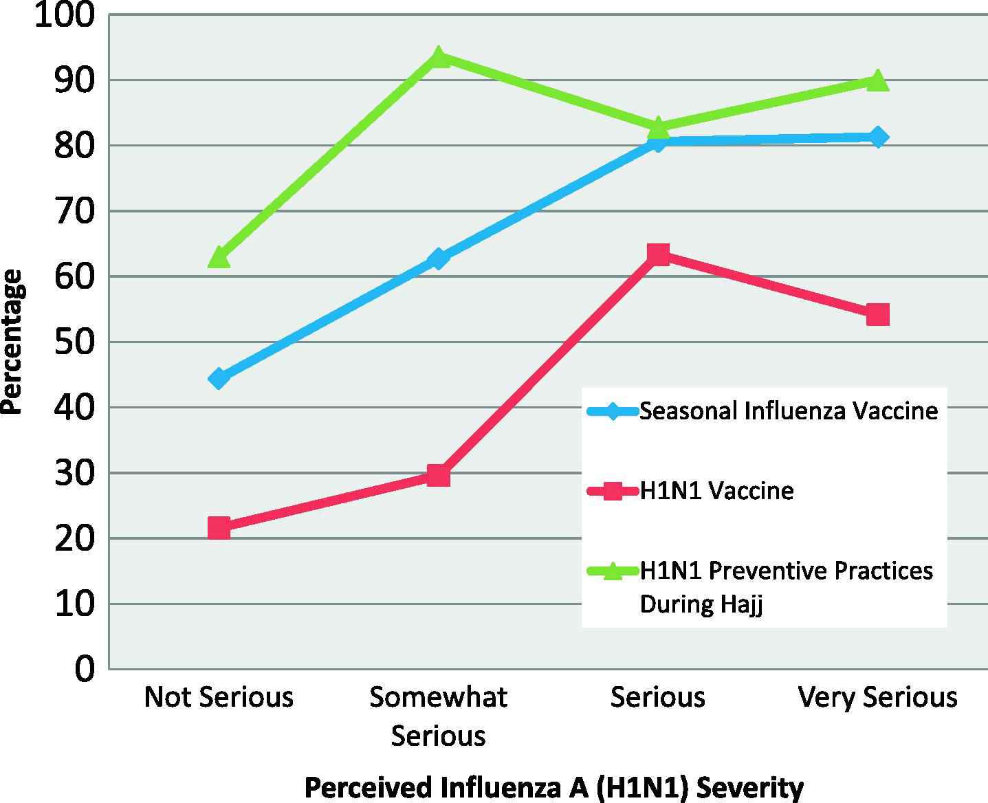 Knowledge of influenza A (H1N1) symptoms, transmission, and prevention was associated with greater perceived severity of influenza A (H1N1); and perceived H1N1 severity was associated with engaging in all three protective health practices assessed in the survey (seasonal influenza vaccination, influenza A [H1N1] vaccination, and engaging in H1N1 protective behaviors during the Hajj). These results are consistent with behavioral science theories that the impact of health information is mediated by underlying beliefs that can either facilitate or discourage the adoption of health behaviors [4].