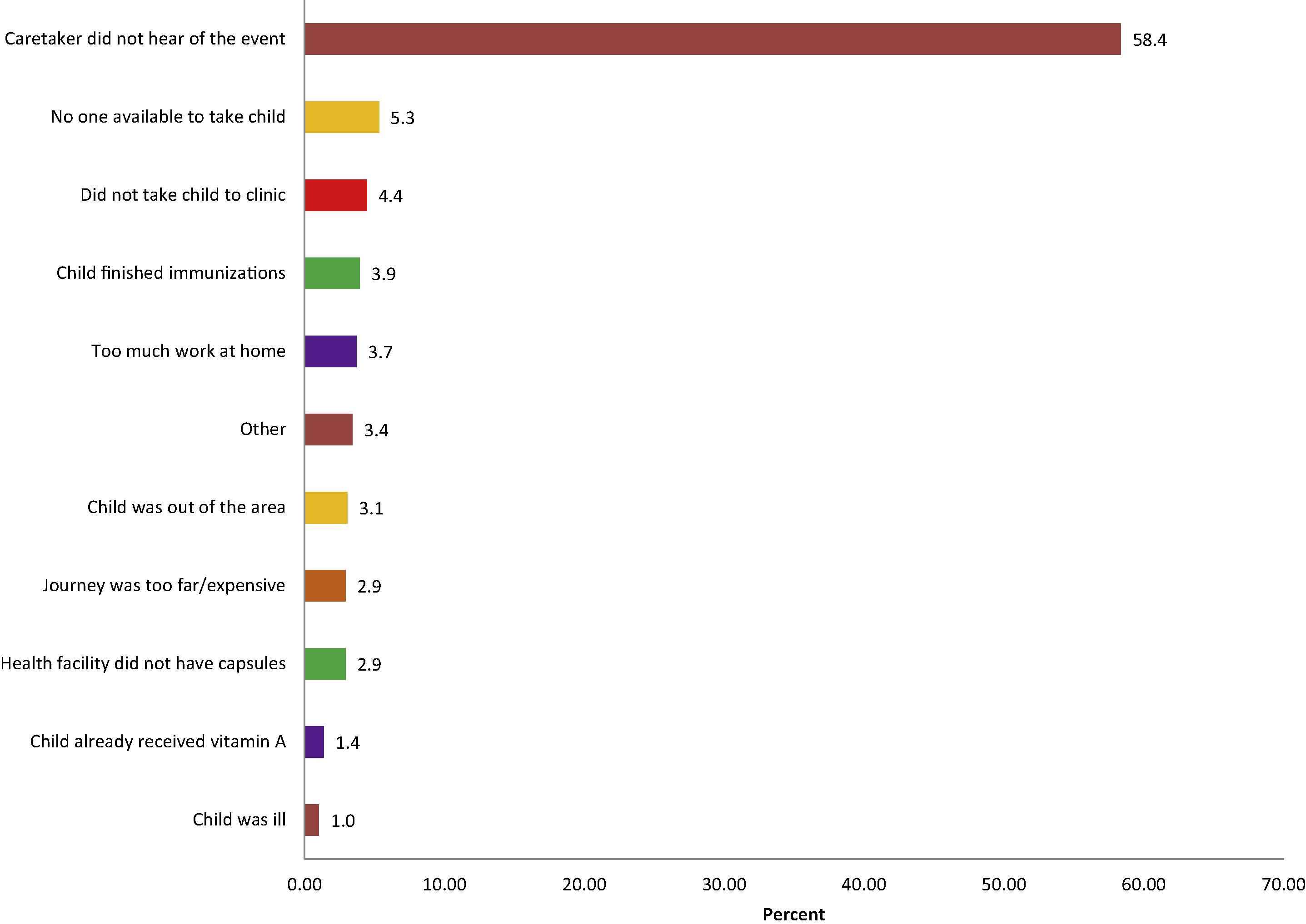 Coverage of VAS was 31.0% among children aged 6–59 months and coverage of deworming was 19.6% among children aged 12–59 months during the May 2012 Malezi Bora (Fig. 1). Coverage of VAS for children aged 6–11 months (45.6%, n = 117) was significantly higher than for children aged 12–59 months (28.8%, n = 783) (p < 0.01). Health facilities and dispensaries (45.7%) were the most frequently reported locations of VAS delivery during Malezi Bora, with VAS also received at the home (38.9%), at district hospitals (9.1%), mobile health posts (4.0%) and ECD (1.1%). The primary reasons that caregivers cited for not attending Malezi Bora were not having heard of the event (58.4%) and not having anyone available to take the child (5.3%) (Fig. 2).