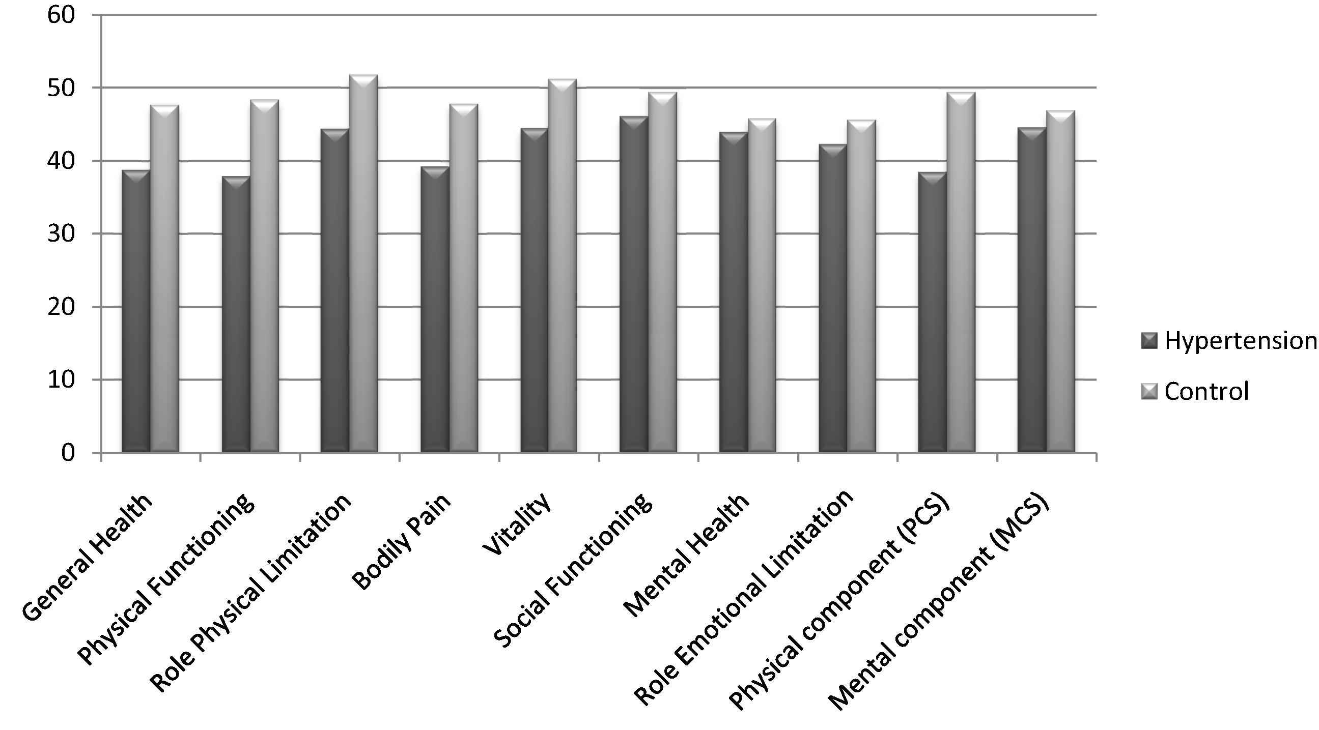 Controls had higher significant scores (p < 0.05) than hypertensive individuals in all domains of the QOL score. Controls showed better QOL in general health, physical functioning, role physical limitation, bodily pain, vitality, and PCS with (p < 0.001). They also showed better health performance in mental health related items including social functioning (p = 0.033), mental health (p = 0.011), emotional limitation role (p < 0.001), and MCS (p = 0.026) (Fig. 1).