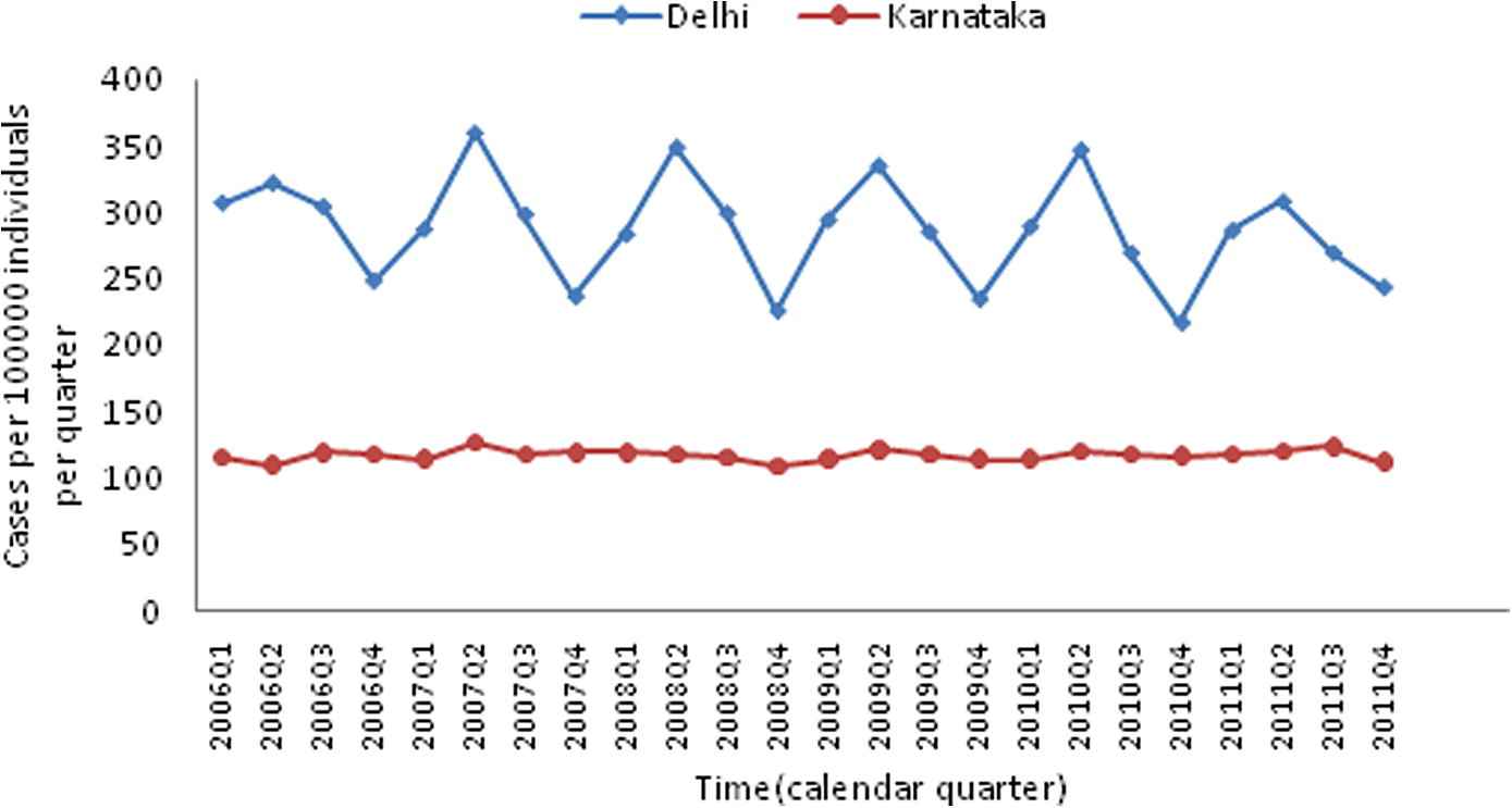 We also analyze the number of suspects examined per 100,000 populations per quarter during 2006–2011. The number of suspects in Delhi is found to be higher as compared to Karnataka, however no quarterly variation is observed in Delhi and Karnataka as shown in Fig. 2. This implies, seasonality is not due to patients examined, but is derived due to other factors [14].