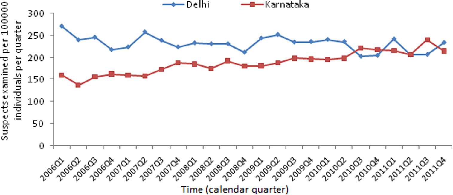 Suspects examined per 100,000 populations for two Indian states, Delhi (northern state) and Karnataka (southern state).