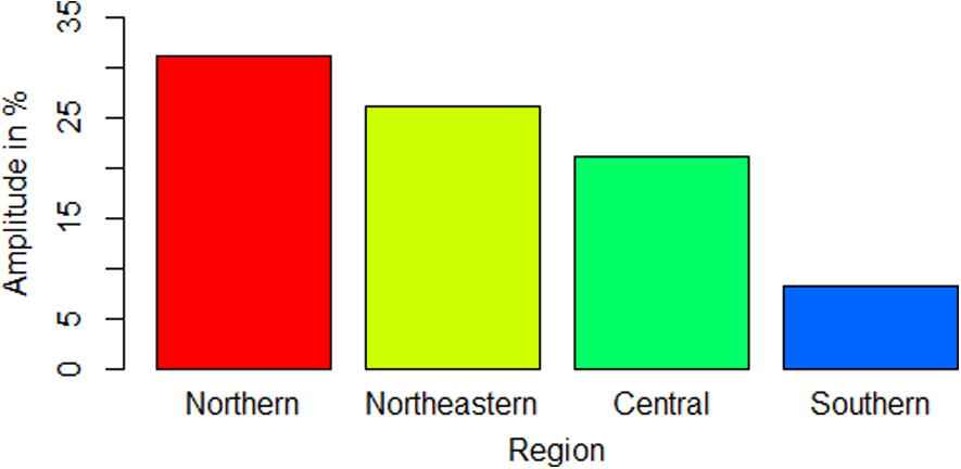 Highest seasonal variation is observed among the north and north east region of the country, whereas very low seasonality is seen in south India and coastal region of the country. Central India exhibits a moderate seasonality as shown in Fig. 4. The amplitude of seasonality on regional basis is shown in Fig. 5. The bar plot exhibits the highest seasonal amplitude in northern region whereas lowest in southern region.