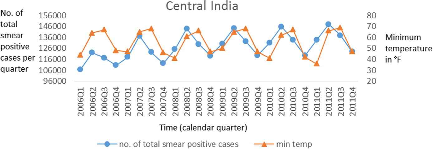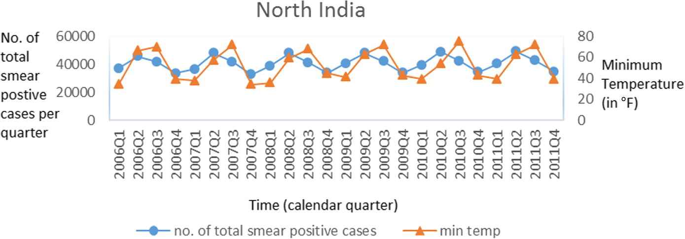 A significant seasonal variation in tuberculosis (TB) is observed in north India during 2006–2011, particularly in states like Himachal Pradesh, Haryana and Rajasthan. To quantify the seasonal variation, we measure average amplitude (peak to trough distance) across seasons in smear positive cases of TB and observe that it is maximum for Himachal Pradesh (40.01%) and minimum for Maharashtra (3.87%). In north India, smear positive cases peak in second quarter (April–June) and reach a trough in fourth quarter (October–December), however low seasonal variation is observed in southern region of the country. The significant correlations as 0.64 (p-value < 0.001), 0.54 (p-value < 0.01) and 0.42 (p-value < 0.05) are observed between minimum temperature and seasonality of TB at lag-1 in north, central and northeast India respectively. However, in south India, this correlation is not significant.