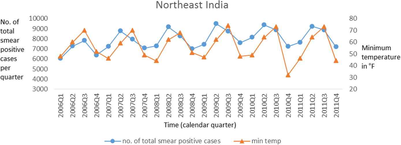 We further investigate the quarterly lag relationship of temperature on number of smear positive cases. At lag-1, correlation between minimum temperature and number of smear positive cases is found to be 0.64 (p-value < 0.001), 0.42 (p-value < 0.05), 0.54 (p-value < 0.01) and 0.33 (p-value < 0.15) in north, northeast, central and south region respectively. These findings show that the strong and significant relation of minimum temperature and the number of smear positive cases in north, northeast and central region. This may be explained through time interval between primary infection of TB or re-activation of latent TB and observable stage of TB. However, relationship of minimum temperature and number of smear positive cases in south region of India is very weak and insignificant. Low variation in temperature and high levels of minimum temperature as compared to north region may be the reasons behind the weak correlation in south region.