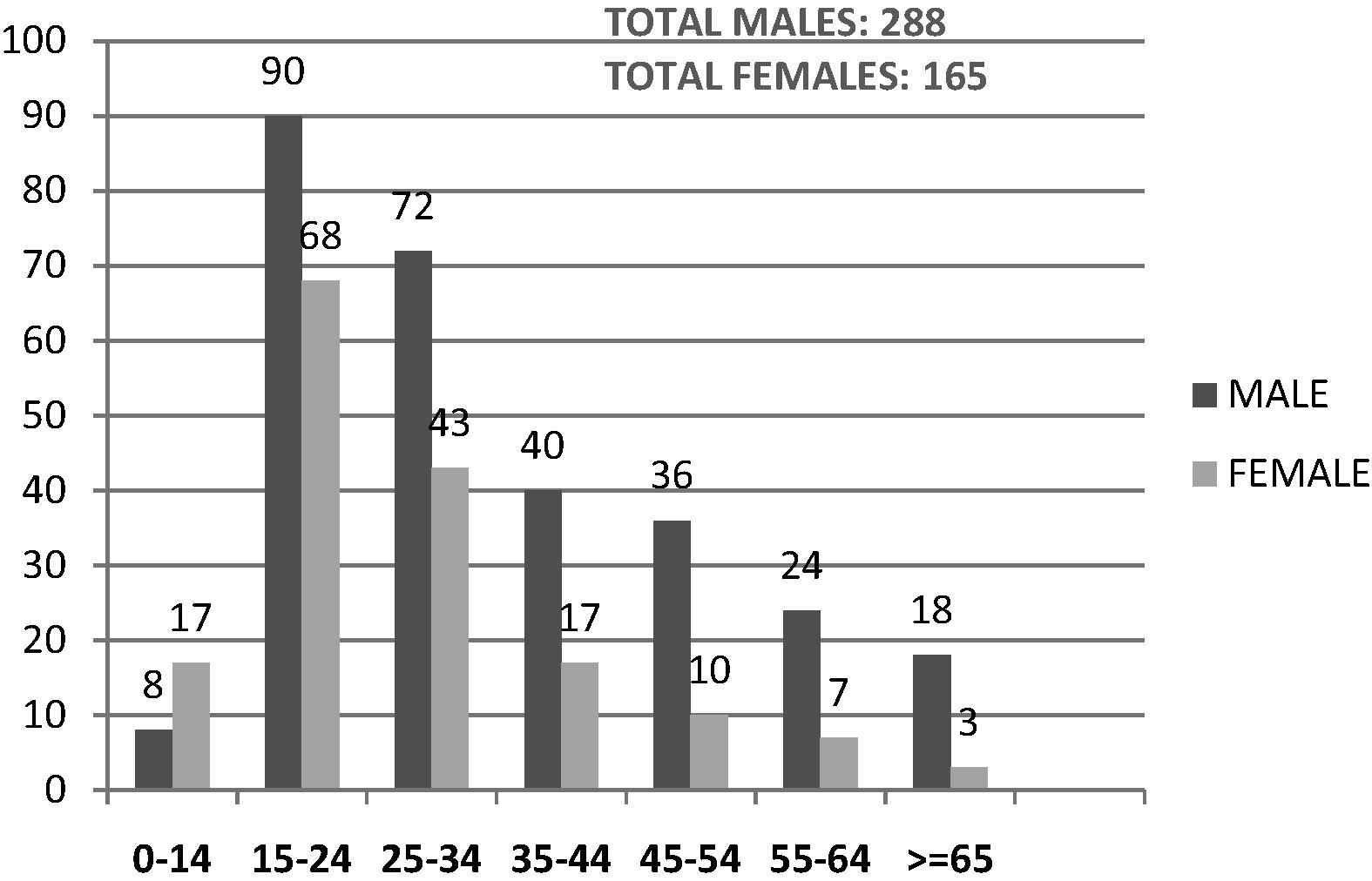 During period of July 2011 to June 2012, 453 newly diagnosed PTB cases were enrolled in this study. Age ranged from 10 year to 85 year old with median age being 27. Maximum patients were in the age group of 15–24 years (158). Overall, males predominated with ratio of males to females being 1.7:1. Females were commoner in the paediatric age group of 0–14 years of age (ratio 1.9:1) (Fig. 1). Of the 453 patients enrolled, 62.3% had no known risk factors. Smoking was found to be the commonest risk factor. The HIV positive patients formed 3.8% of the study group. Two percent of patients were found to be diabetics (Fig. 2). Commonest clinical symptoms reported by the recruits are depicted in Fig. 3. Maximum patients complained of fever (80.8%), weight loss (79.9%) and cough with expectoration (79.7%).