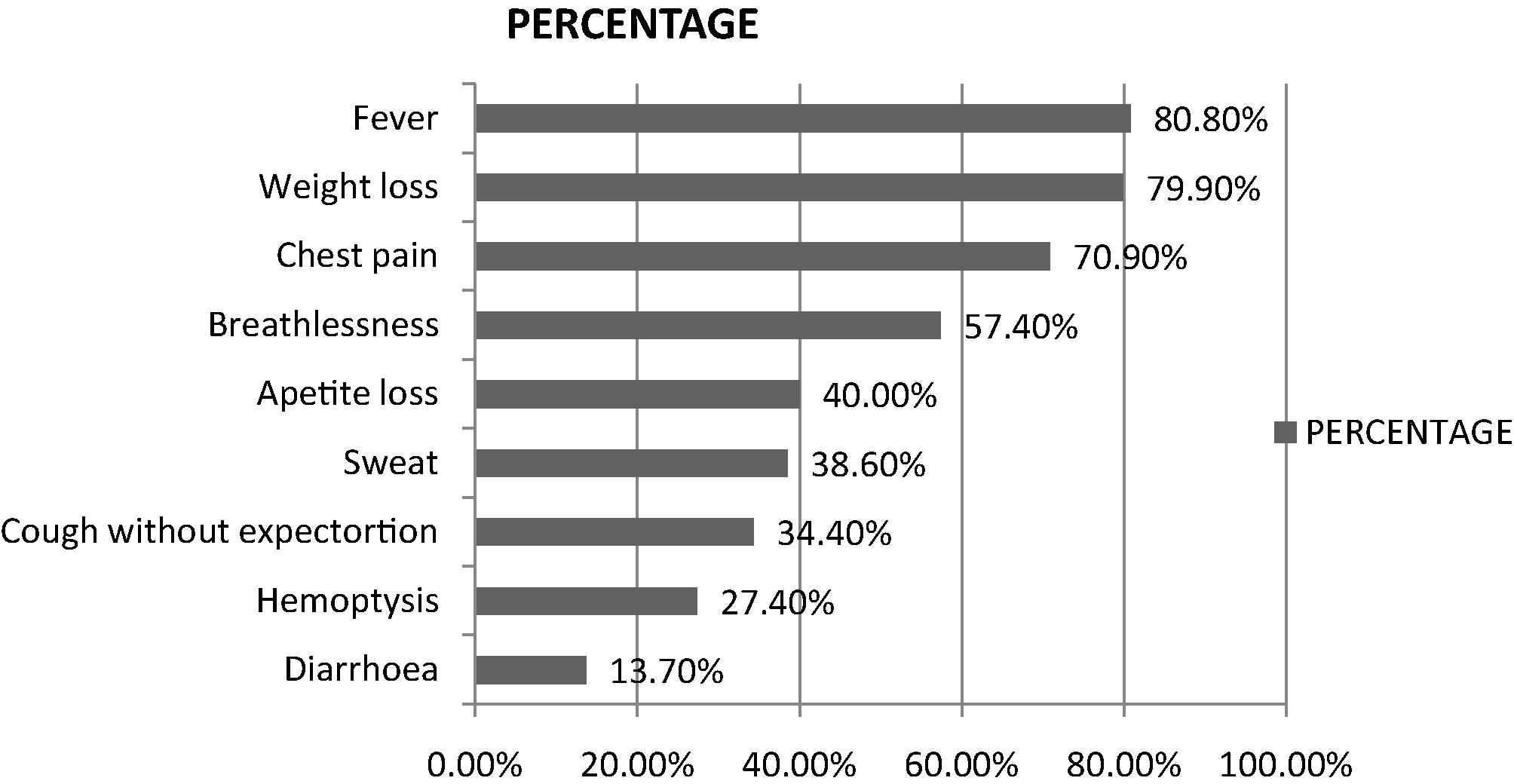 Commonest symptoms reported by the patients enrolled in the study included fever (80.8%), weight loss (79.9%) and cough with expectoration (79.7%), which are known in PTB patients. Surprisingly, 40% patients only complained of loss of appetite. Appetite-regulatory hormones are altered in TB patients, which improve on treatment [12].
