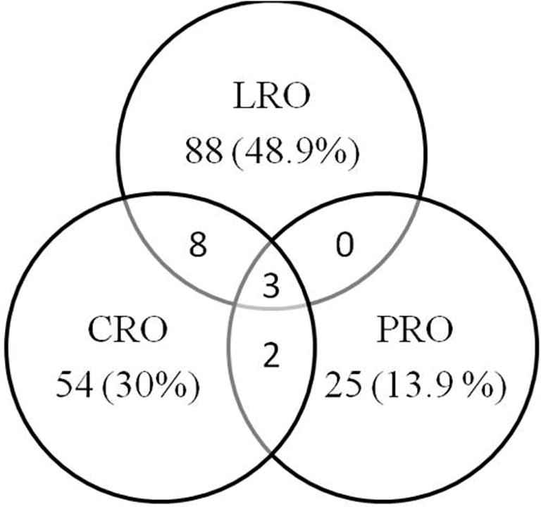 Endpoint combinations (N = 180). CRO: n = 54 (30.0%); LRO: n = 88 (48.9%); PRO: n = 25 (13.9%); CRO + LRO: n = 8 (4.4%); CRO + PRO: n = 2 (1.1%); PRO + LRO: n = 0 (0.0%); CRO + LRO + PRO: n = 3 (1.7%).