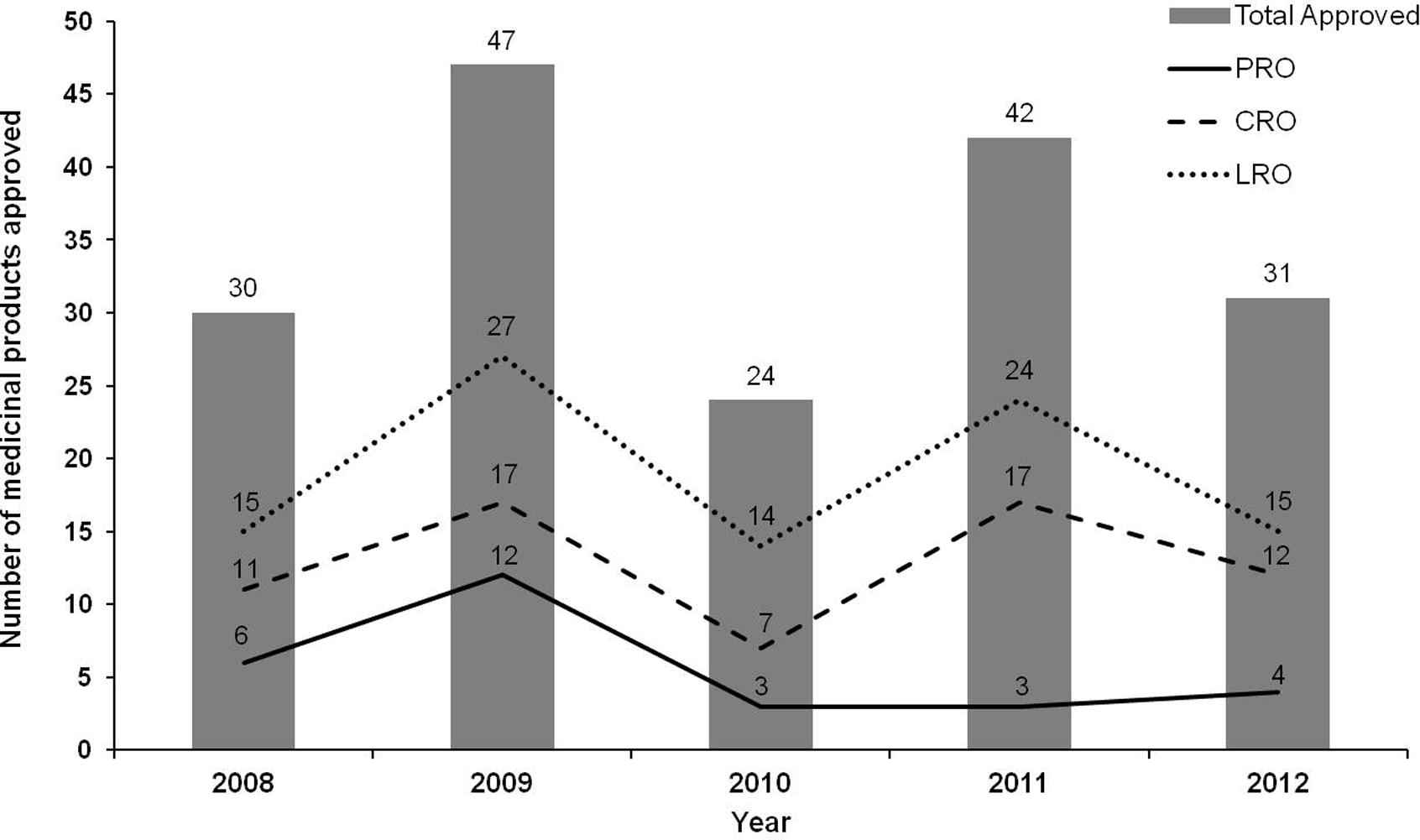 A systematic comprehensive electronic and manual search was performed herein for all the product-level regulatory documents (EPAR) published by EMA [23] from January 2008 to December 2012, with a special emphasis given to PROs being used in the regulatory process. The present analysis reviewed the distribution of CRO/LRO/PRO as clinical trial endpoints during the medicinal product approval prior to marketing authorization.