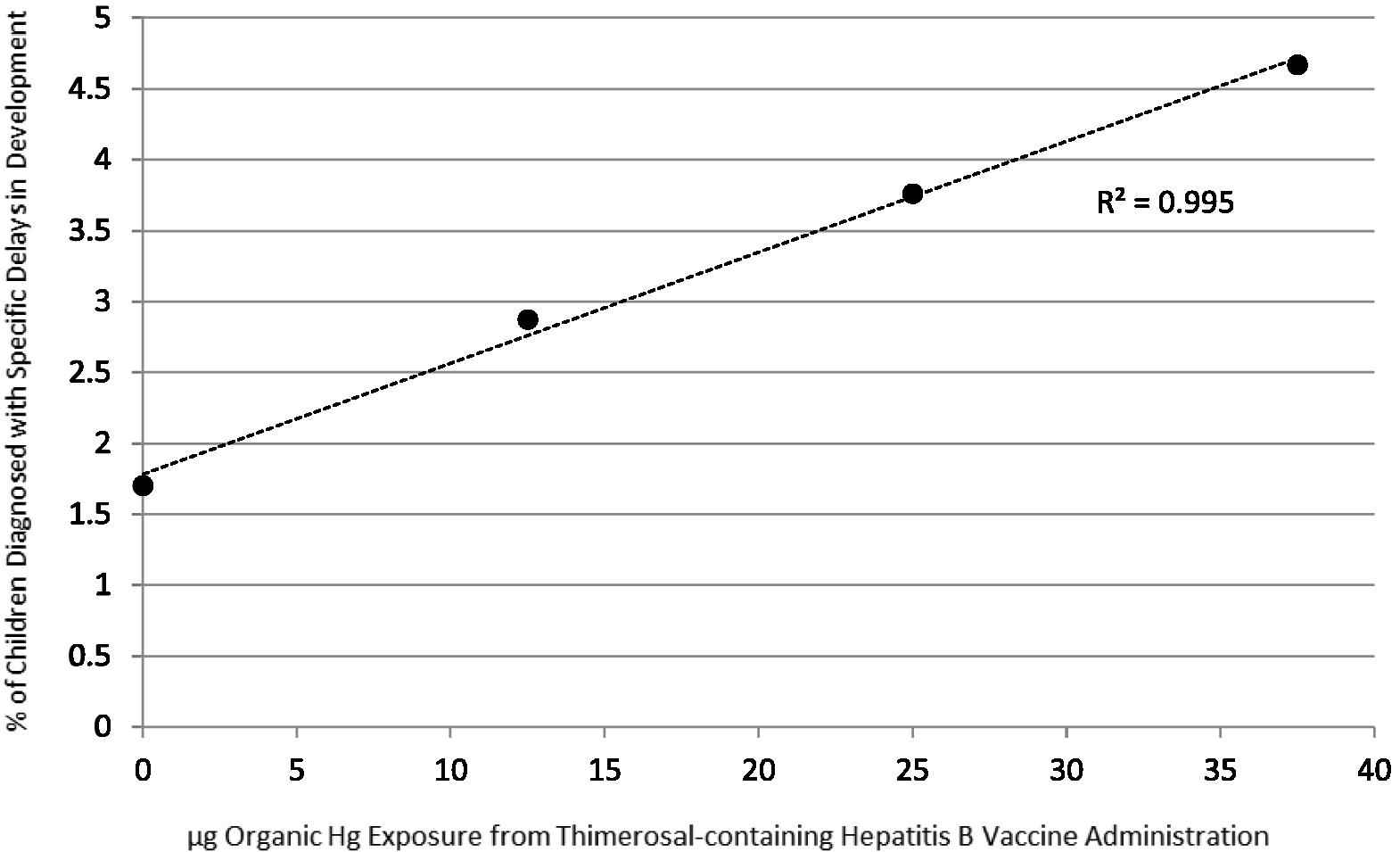 The second set of experiments examined the potential dose–response relationship between increasing amounts of organic Hg exposure from T-HBV administration and the frequency of diagnosed specific delays in development utilizing the linear regression and Fisher’s exact statistical tests. The linear regression test was employed to compare the frequency of diagnosed specific delays in development/μg organic Hg exposure from T-HBVs administered within the first 6 months of life. Additionally, the Fisher’s exact statistical test was used to determine the discrete relative risks for the frequency of diagnosed specific delays in development in the cohorts receiving exposure to 12.5 μg organic Hg, 25 μg organic Hg, or 37.5 μg organic Hg from T-HBV doses, in comparison with the cohort receiving 0 μg organic Hg from Thimerosal-free hepatitis B vaccine doses and/or no hepatitis B vaccinations within the first 6 months of life. The overall null hypotheses for each of these comparisons were that there would be no difference in the frequency of diagnosed specific delays in development regardless of exposure to organic Hg from Thimerosal-containing hepatitis vaccines.