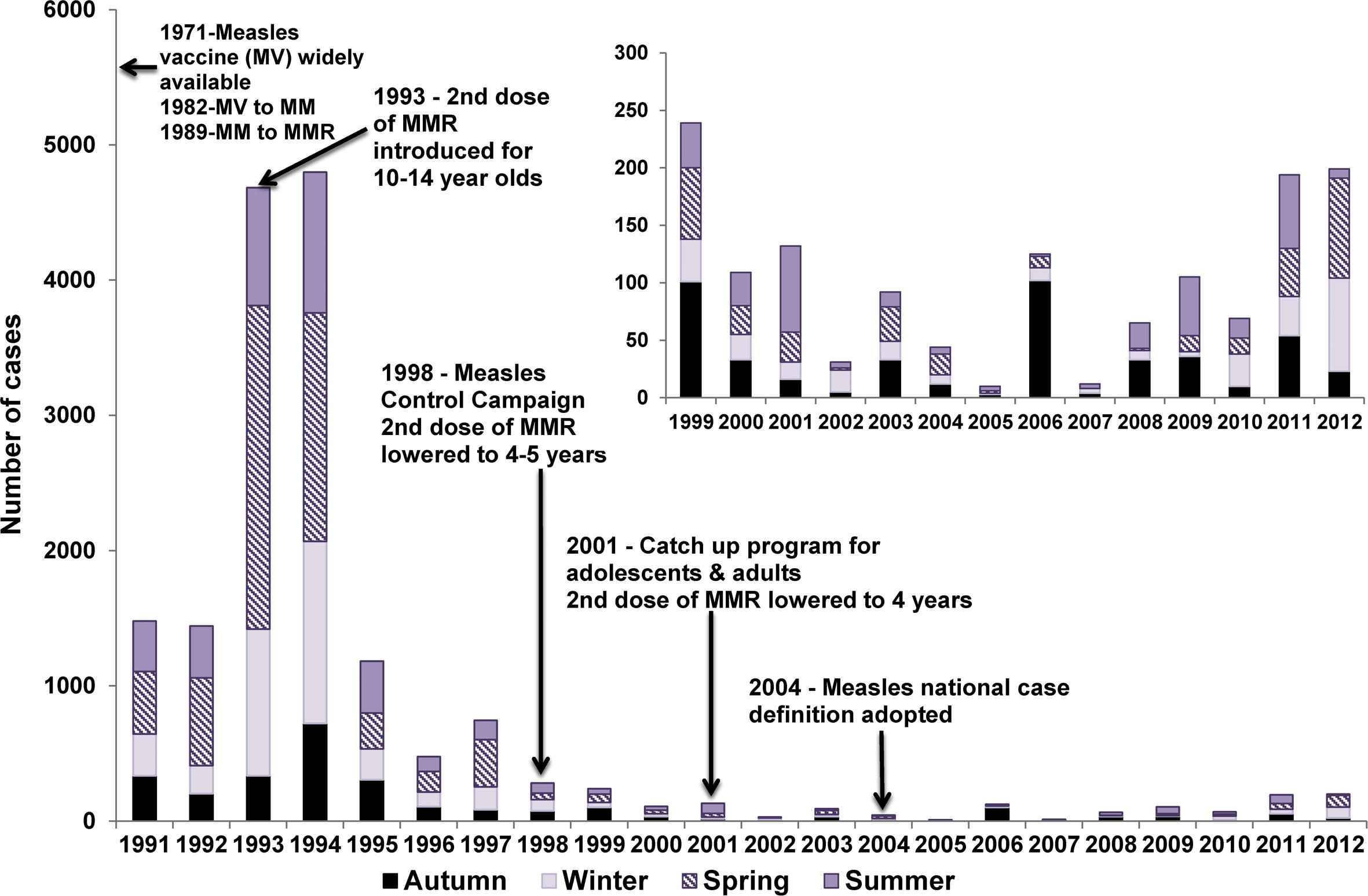 Measles control strategies and notifications by season, Australia, 1991–2012.