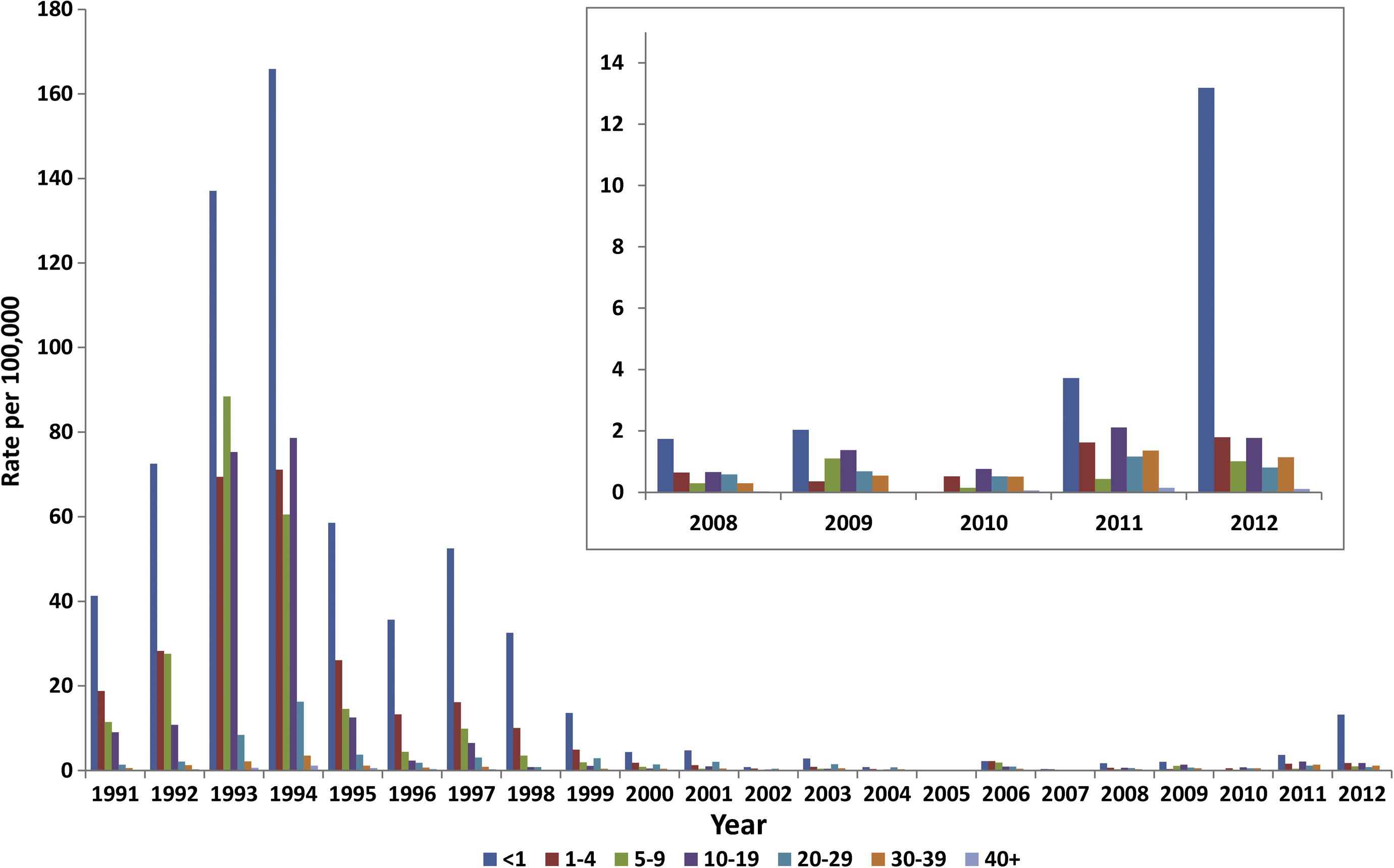Since 1991, infants < 1 year of age have generally had the highest annual age-specific notification rates. The exceptions were 2005 and 2010, when notification rates were low across all age groups (Fig. 2). Since 2000, annual notification rates in age groups other than <1 year have fluctuated, but remained at or below 2.2 per 100,000 with a trend from 2004 onwards of proportionally fewer cases among 20–29-year-olds and more among 10–19-year-olds.