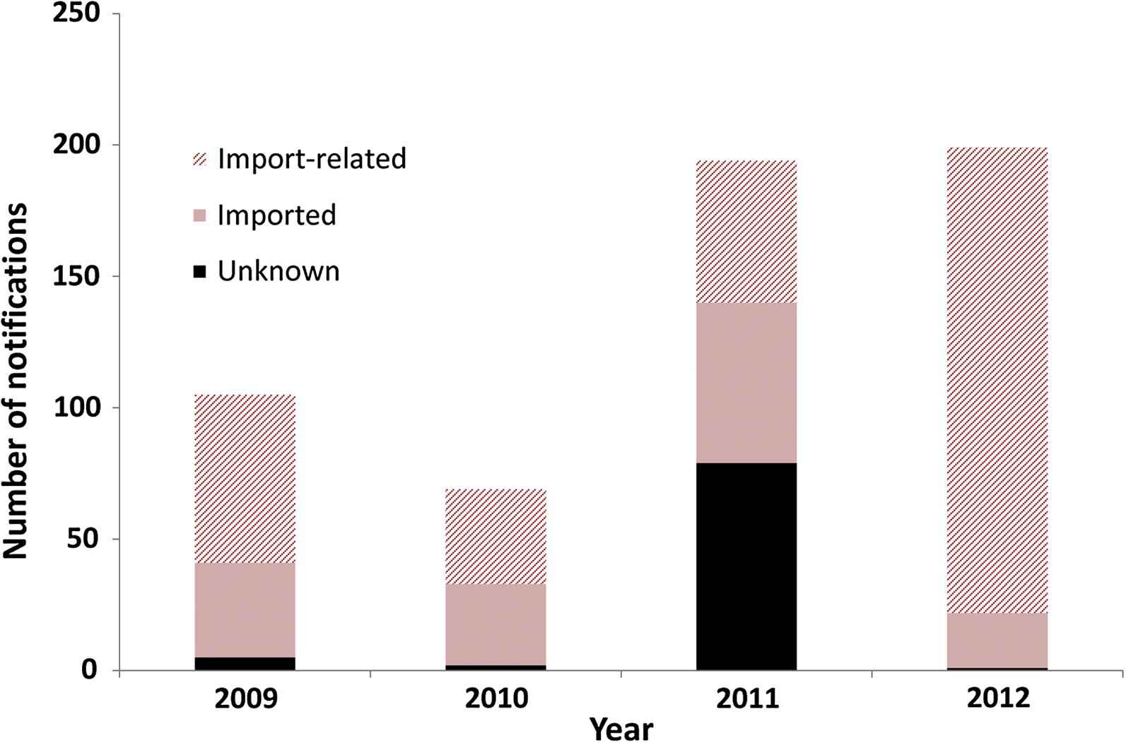 The WHO indicator of 80% or more cases having a known source of infection was achieved in the period 2009–2012, with 85% of cases either imported or import-related (480/567). The proportion of cases with a known source of infection exceeded 95% in all years except for 2011 (59%; Fig. 3). All 87 cases with an unknown source of infection were fully investigated. The five cases in 2009 and one in 2012 were geographically and temporally distinct and therefore classified as sporadic cases. While the two cases in February 2010 were epidemiologically linked, there were no other unknown source cases in 2010 that would indicate an unidentified endemic chain of transmission. Most (79/87; 91%) of the cases with an unknown source were reported in 2011. Of these, 87% (69/79) were in New South Wales (NSW), of which 54 (78%) were from two neighboring regions (Sydney and Illawarra). All 12 epidemiologically linked clusters of unknown source cases in NSW in 2011 were temporally and geographically associated with one of 12 imported cases. However, genotyping results were only available for four of the imported cases and six of the clusters with an unknown source case. Therefore, a definitive link based on virological evidence was not possible, although genotyping results of the six clusters is consistent with repeated importations rather than prolonged transmission of a single virus. Furthermore, there were no reported cases in these local government areas or wider geographic locations in 2012. The remaining 10 cases (including 5 sporadic cases and 2 clusters) occurred in five different jurisdictions, which also suggests transmission associated with several unidentified imported cases.