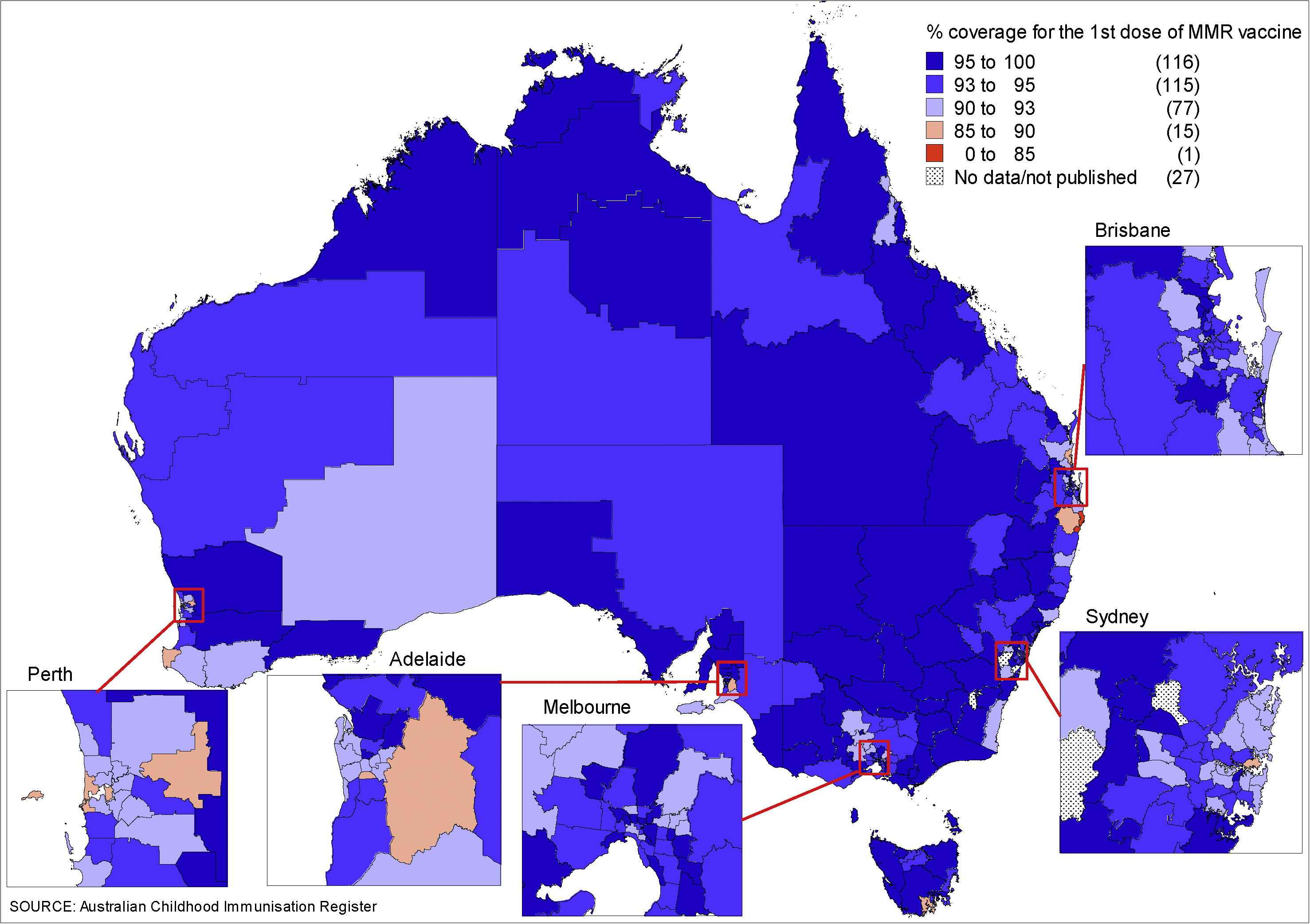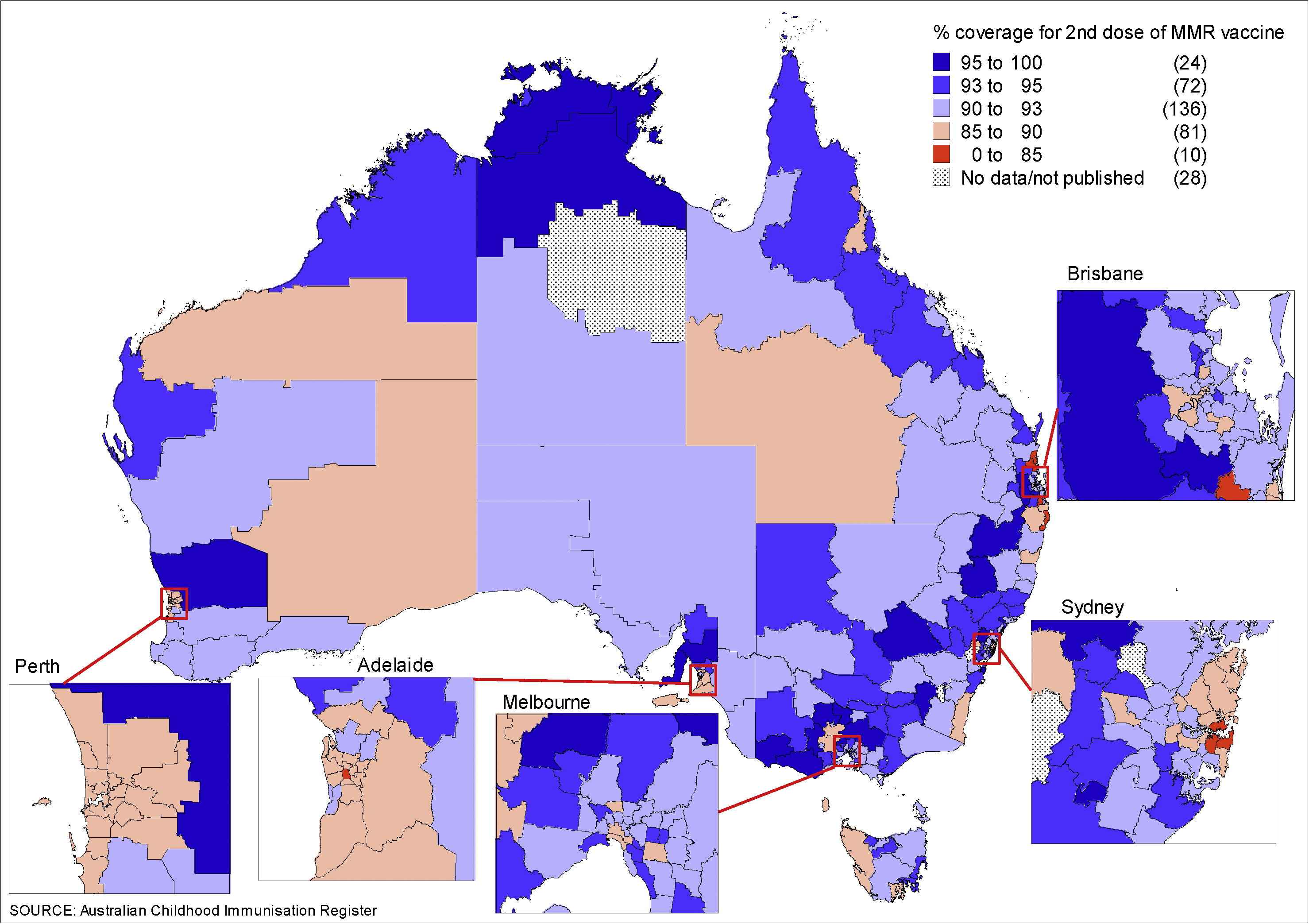 Sustained high levels of immunity across the population achieved through a two dose MMR vaccination program is a prerequisite for measles elimination. The WPR targets for immunity are ⩾95% coverage with both MMR1 and MMR2 nationally and in each district [in Australia’s case Statistical Areas Level 3 (SA3) were used [15] with approximately 30,000–130,000 persons per SA3].