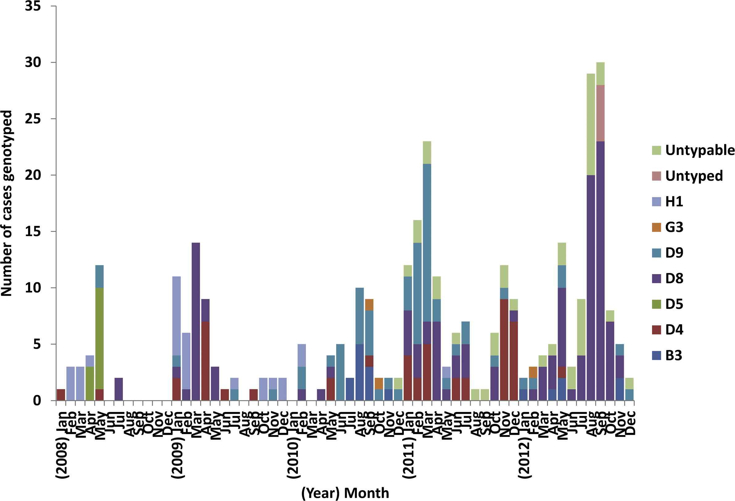 Monthly distribution of measles genotypes identified in Australia, 2008–2012.