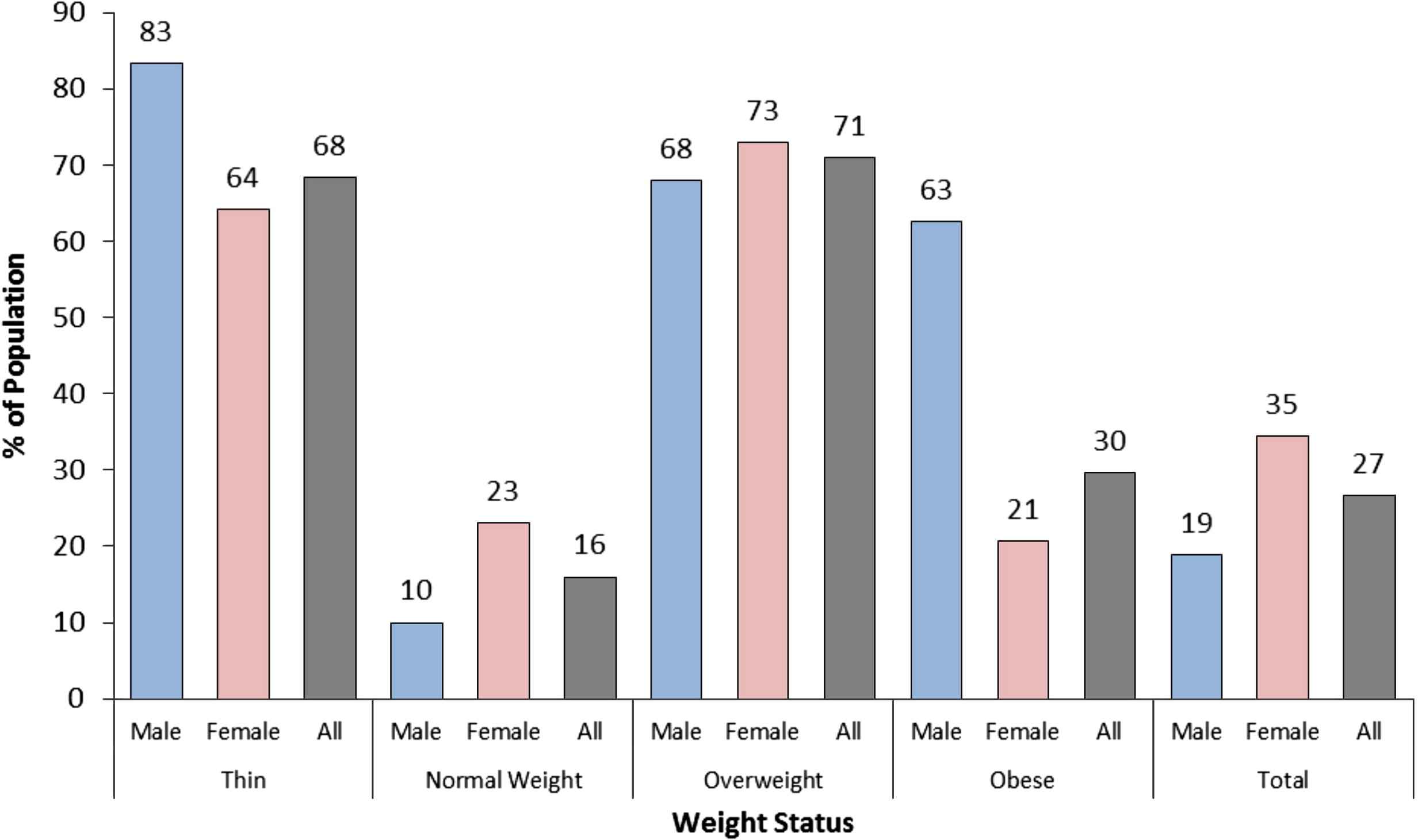Weight misperception was found in 26.7% (18.8% for males and 34.5% for females) of the general population. A greater proportion of thin and obese males misperceived their weights relative to their female counterparts. Conversely, a greater proportion of normal-weight and overweight females misperceived their weights relative to their male counterparts. Irrespective of sex, normal-weight and obese participants misperceived their weight least often, while overweight participants misperceived their weight most often (Fig. 2). All thin participants who misperceived their weight thought they were heavier. Conversely, all obese participants who misperceived their weight thought they were thinner. Among overweight participants, 56.6% of the males and 38.3% of the females thought they were thinner, while 11.5% of the males and 43.3% of the females thought they were heavier (Fig. 3).