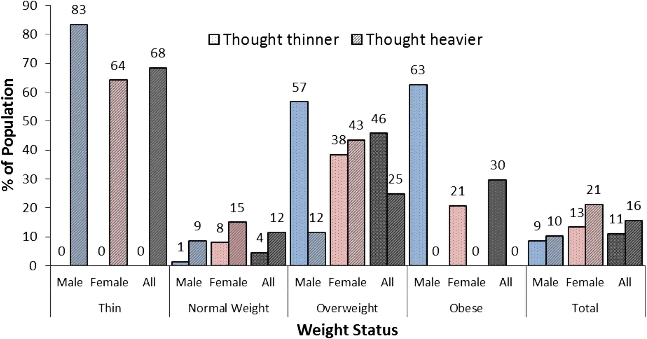 Early adulthood is the period when young adults (females, in particular) are concerned with choosing a partner and starting a family. Therefore, young people pay particular attention to attractiveness and compare themselves to others. Unfortunately, young women tend to compare themselves, sometimes to their detriment, with models and actresses shown in the media. Studies indicate that viewing television programs featuring young and very slim actresses contributes to weight misperception [18]. Weight misperception was found in 26.7% (18.8% for males and 34.5% for females) of the general population, with thin and obese males misperceiving their weight more than their female counterparts. Interestingly, all thin participants who misperceived their weight thought that they were heavier, while all obese participants who misperceived their weight thought that they were thinner. Implicit in this is that these participants may not initiate appropriate behaviour required to remedy their situation. In fact, for overweight and obese individuals, weight underestimation results in a lack of motivation to change their poor lifestyle, thereby leading to further adipose tissue accumulation [19]. Conversely, normal-weight and overweight females misperceived their weight more often than their male counterparts. As much as 15% and 43% of normal-weight and overweight females with BSD, respectively, thought they were heavier as compared with 9% and 12%, respectively, for their male counterparts. These candidates are more likely to adopt risky weight-loss measures, such as crash diets and/or starvation, very intensive physical effort, or the use of medicine [20], all with potential deleterious consequences [4].