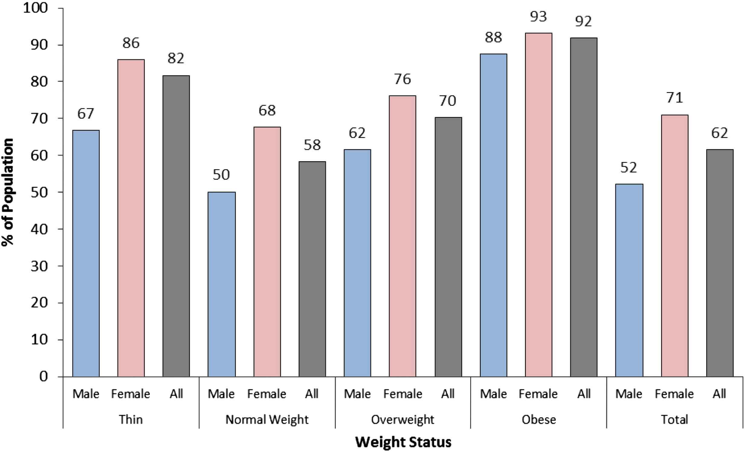 Prevalence of body-shape dissatisfaction in the population, stratified by body mass index-defined weight status.