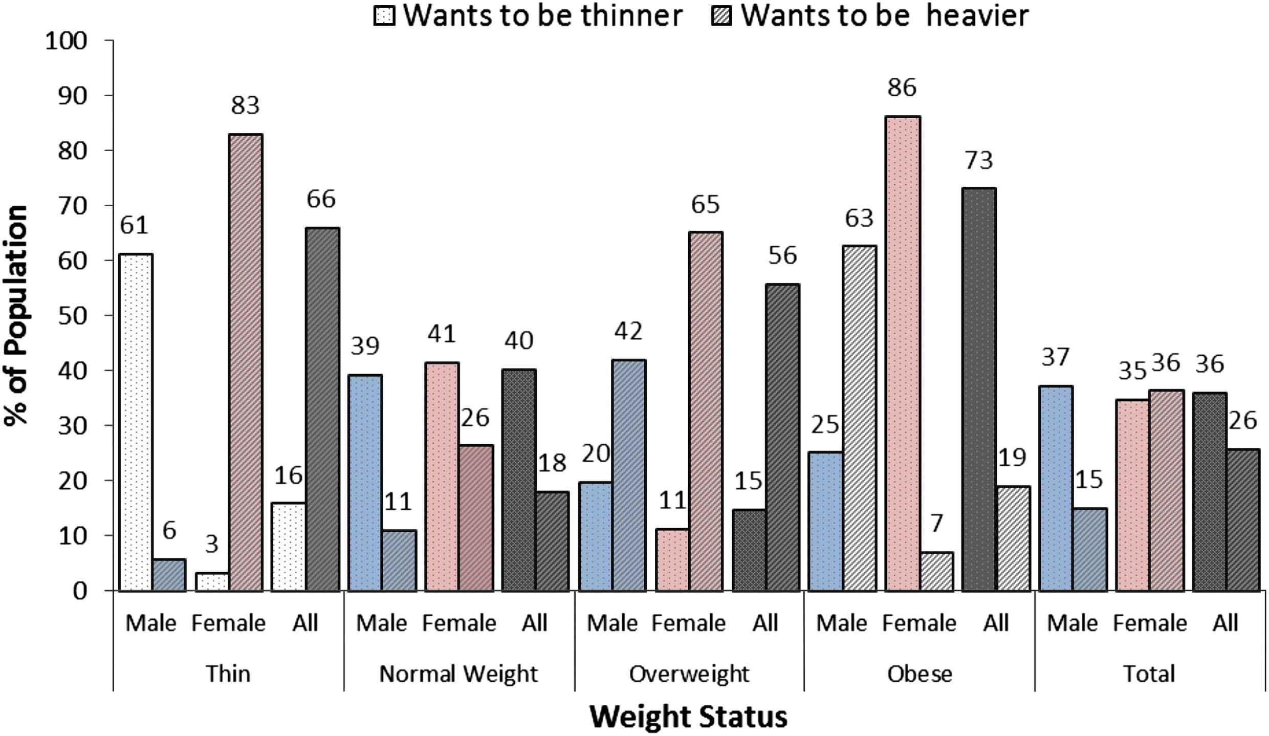 Irrespective of weight status, more than half the study population was dissatisfied with their body shape. For example, among normal-weight participants, 50.1% of the males and 67.6% of the females had BSD. Again, irrespective of weight/nutritional status, a greater proportion of females had BSD as compared to males. Body-shape dissatisfaction was highest among obese participants (91.9%) and lowest among normal-weight participants (58.2%), irrespective of sex (Fig. 4). Among thin participants with BSD, 61.1% of the males preferred to be thinner, while 5.6% preferred to be heavier. For females, only 3.1% wanted to be thinner and 82.6% wanted to be heavier. As much as 62.5% of obese males with BSD preferred to be heavier as compared with only 6.9% of obese females who preferred to be heavier. Irrespective of sex, a greater proportion of normal-weight participants preferred to be thinner, while a greater proportion of overweight participants preferred to be heavier (Fig. 5).