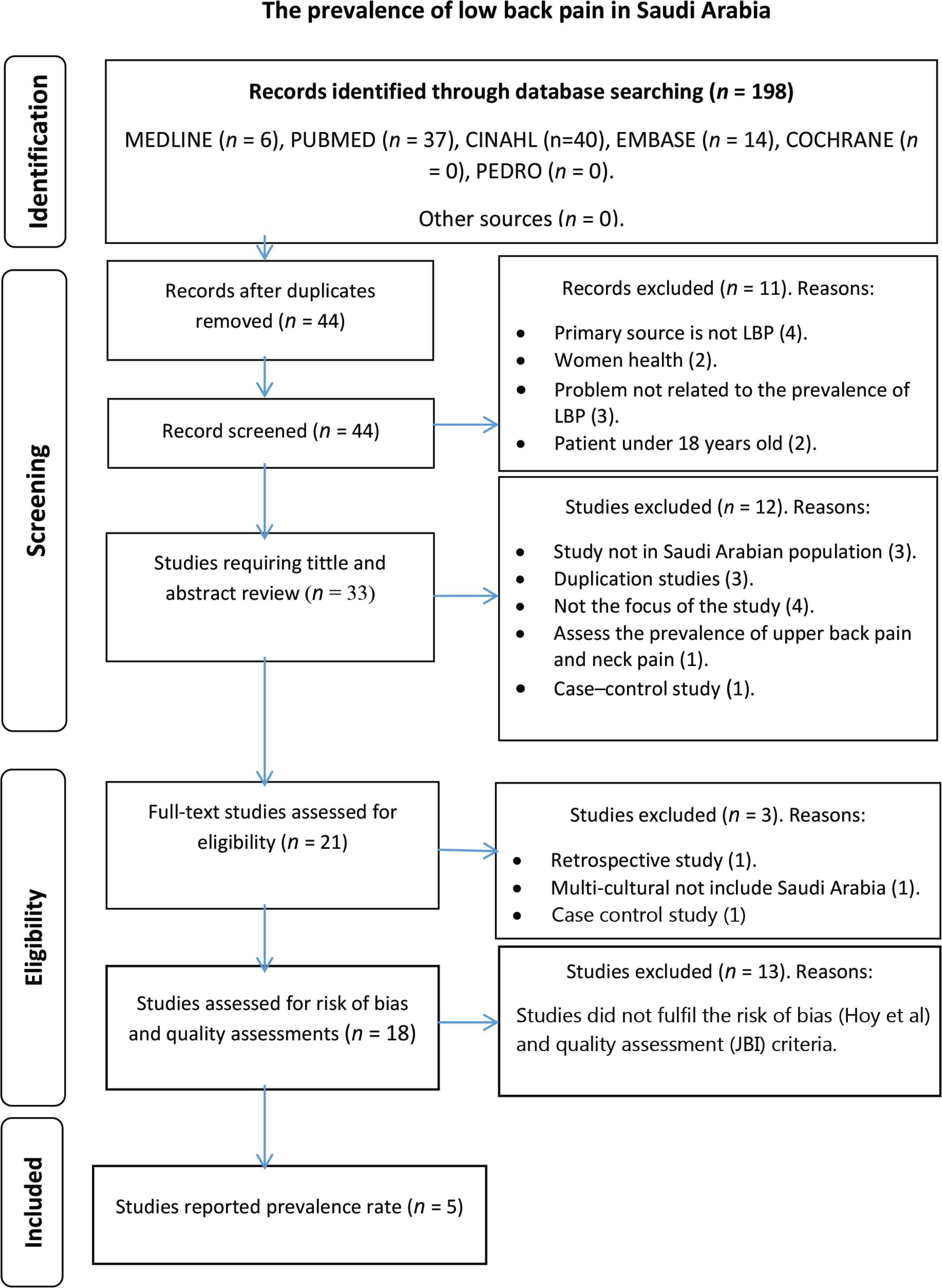 Studies were included if they met the following criteria: the paper included adults who were complaining of acute or chronic LBP; were cross-sectional or cohort studies published in peer-reviewed journals between January 1990 and December 2018. The publication dates were limited to start at 1990 to take into consideration the growth of the Saudi Arabian population since that time. Exclusion criteria were: studies involving people under 18 years of age; studies in which the primary focus of the study was not LBP, studies of pregnant women, drug trials, case–control and retrospective studies. Also, studies were excluded if they did not meet the quality criteria according to the Joanna Briggs Institute (JBI) assessment (http://joannabriggs.org) [8] and studies with high or medium risk of bias according to the Hoy et al. [9] criteria.