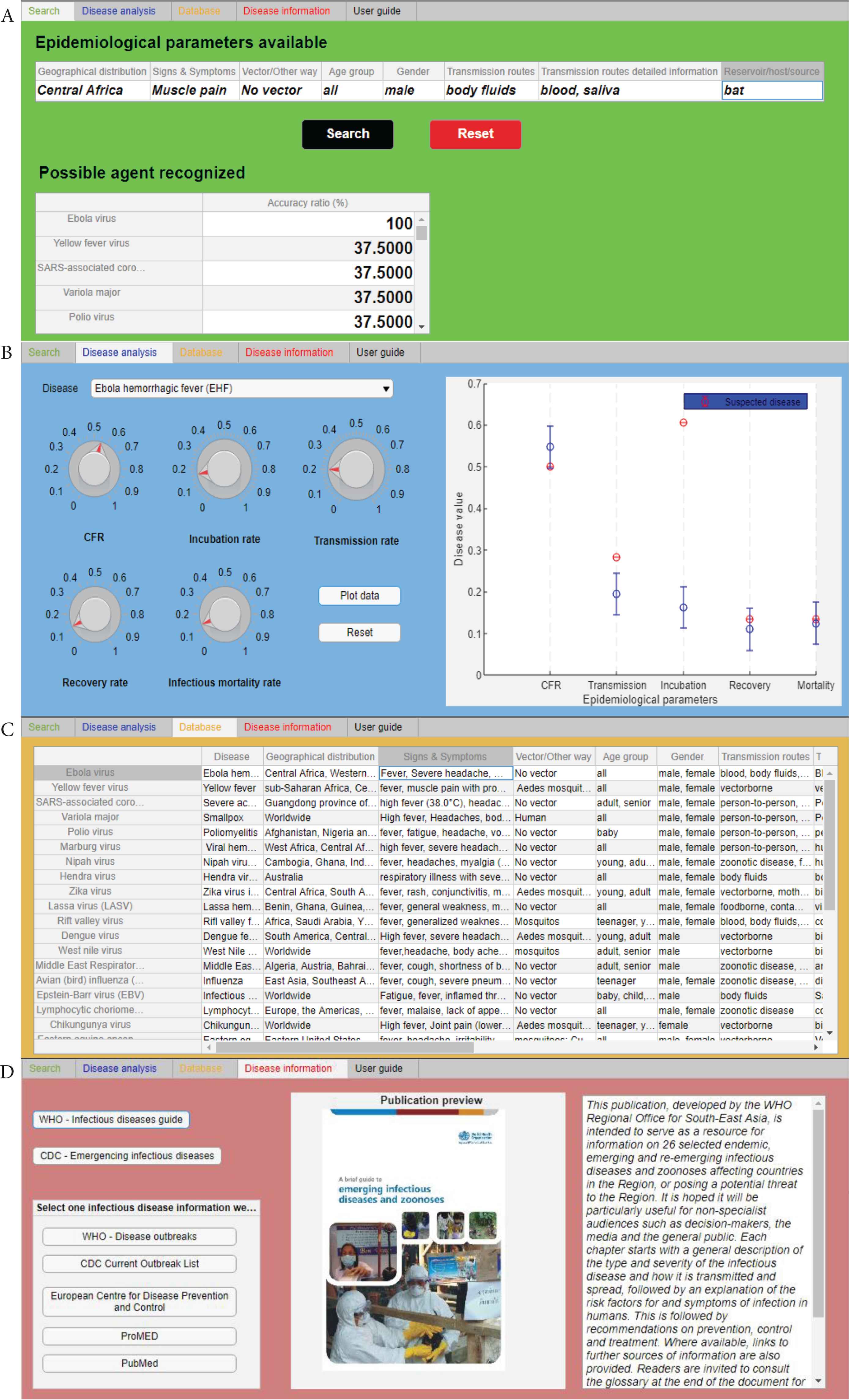 According to the results of these preliminary tests, the overall outcomes provided by the software are promising. The tool was stressed adequately testing three recent and relevant outbreaks of infectious diseases. In particular, the first step has been to test the capacities of the “Search” tab (green tab): the outcomes reveal that the IDS prototype has been able to identify all of the three agents and differentiate them with the rest of the agents loaded in the database (Figure 4).