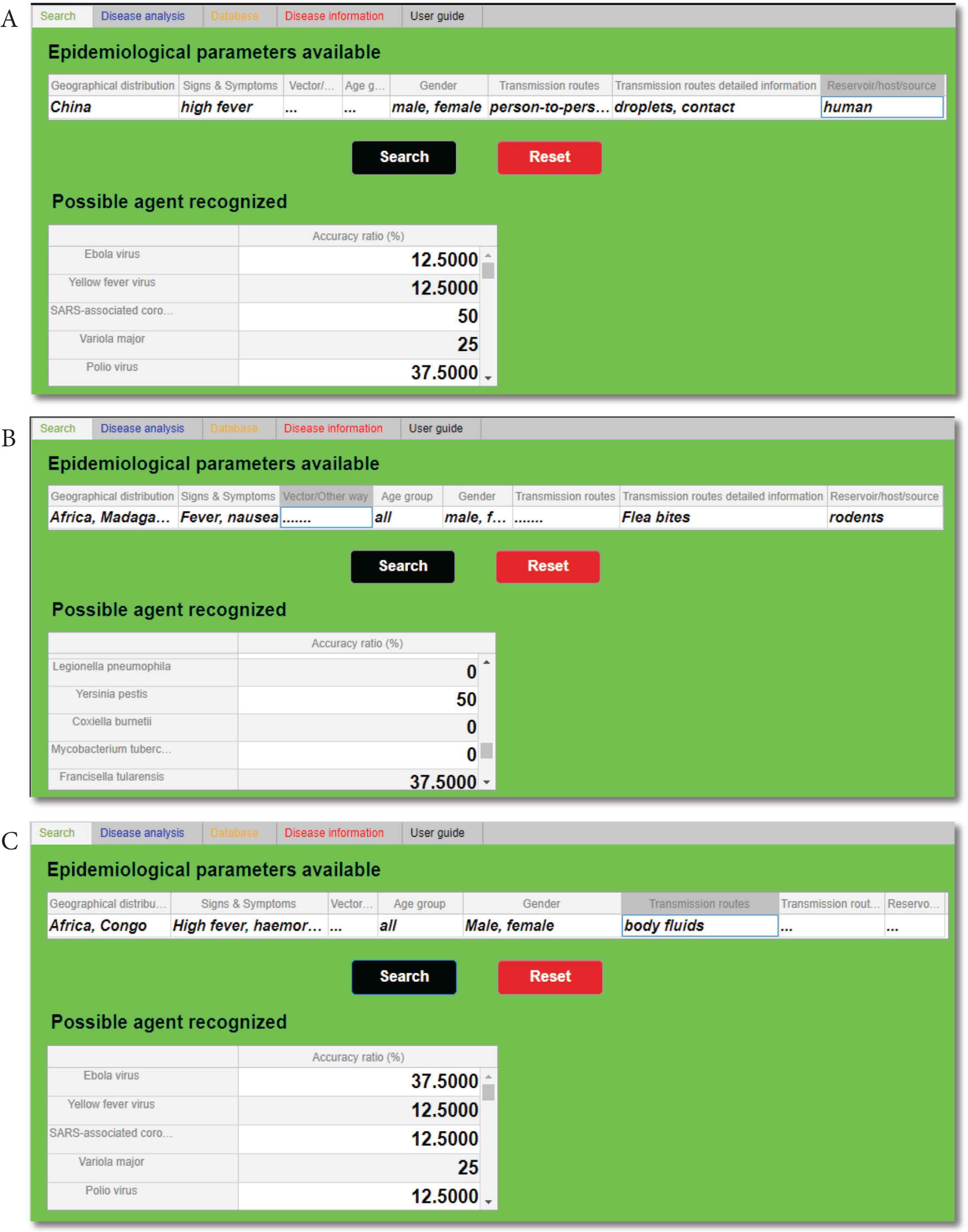 Outputs of the “Search” tab. In section “Possible agent recognized”, after the initial epidemiological parameters have been filled in, is possible to identify each time the highest accuracy ratio (%): SARS-associated coronavirus (A), Yersinia pestis (B), and Ebola virus (C).