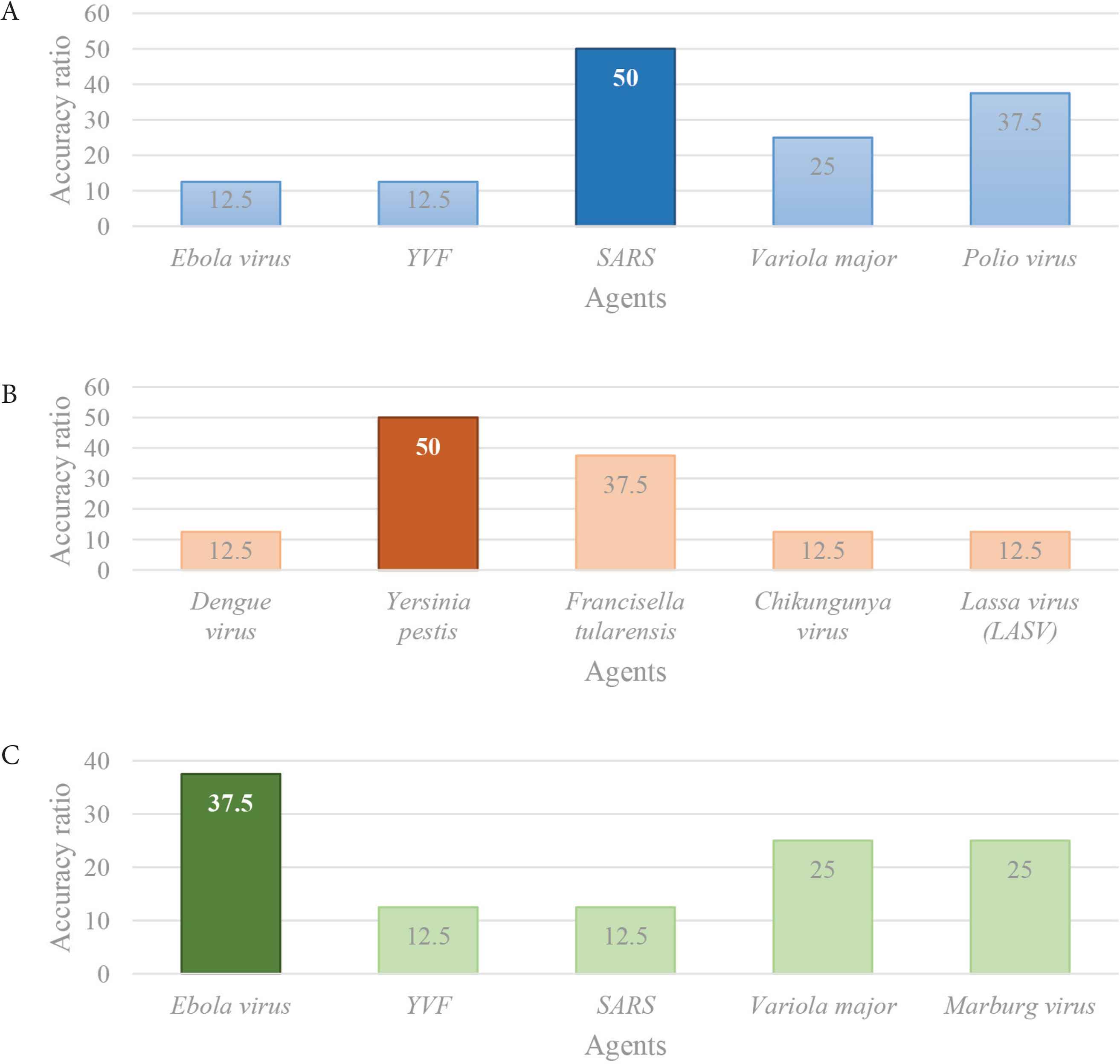 It is important to underline that the search function has recognized all of the three agents analysed: it has discerned the more probable agents within the others. In fact, the tool was able to identify SARS-associated CoV and Yersinia pestis with an accuracy of 50%, and Ebola virus with an accuracy of 37.5% (Figure 4). It is essential to clarify that, as also shown in Table 2A, the data available at the beginning of these three outbreaks were incomplete, and the presence of these deficiencies has affected the accuracy ratios.