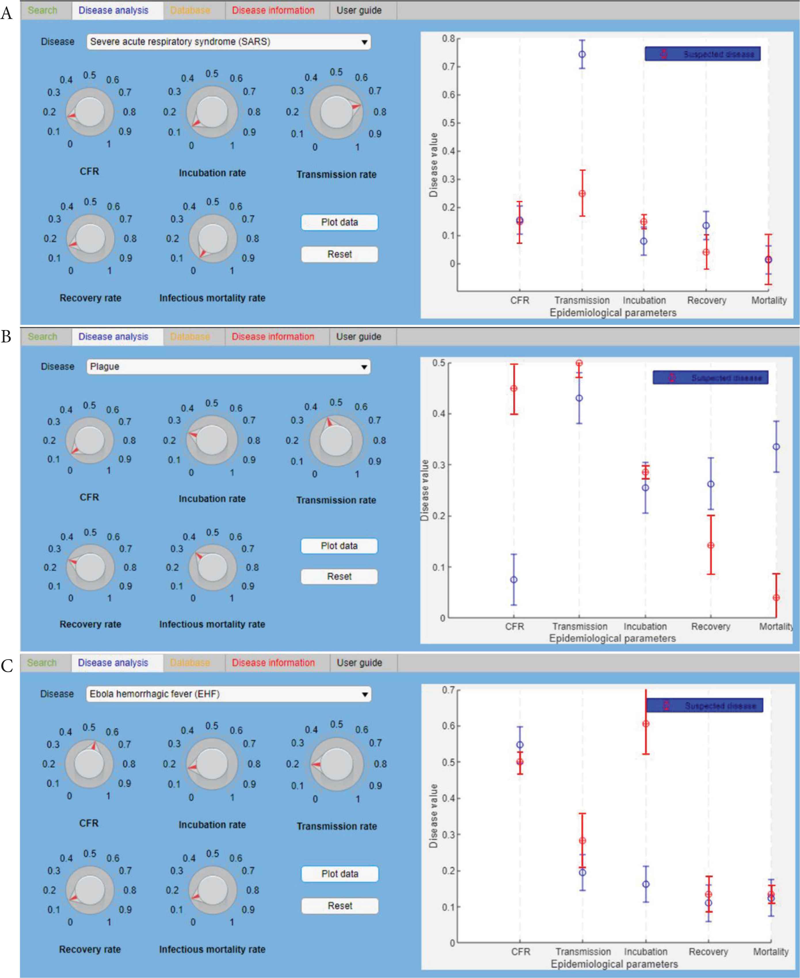 The “Disease analysis” tab. It shows the comparison between the database (red spots) and the disease data (blue spots), respectively, of SARS (A), Plague (B), and EVD (C). The fixed standard deviation (SD) of blue spots is 0.05 (5%).