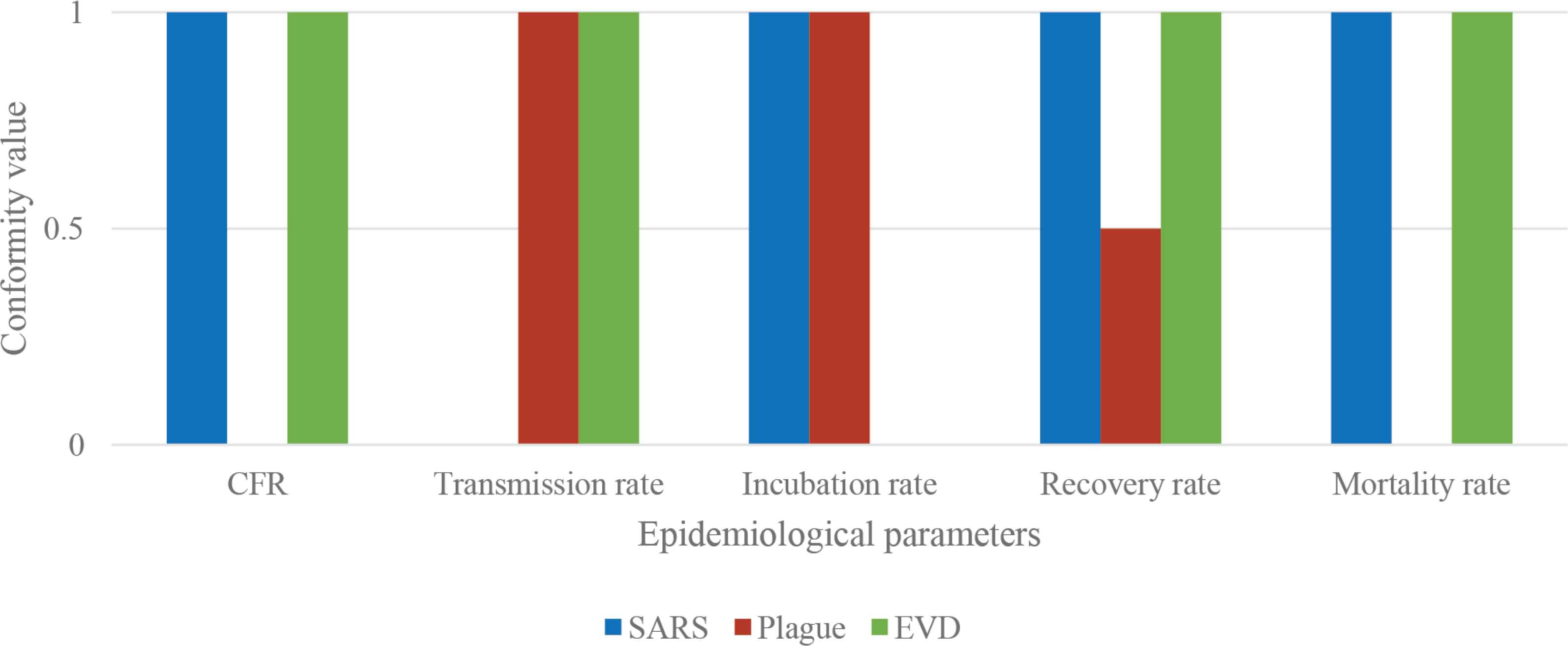 The disease analysis function seems to have some little variance between the data of the database and the three diseases. In Figure 6, these variations have been graphically summarized. In particular, the scheme represents the correspondence for each of the five epidemiological parameters (CFR, transmission rate, incubation rate, recovery rate, and mortality rate) between the data from the database and the real cases considered in Table 2B (SARS in blue, Plague in red, and EVD in green). Three different conformity values have been assigned: 1 means that there is a 95 ± 5% correspondence between the database and the real case; 0.5 means that the correspondence is 50 ± 5%; 0 means that there is not a correspondence between data. A schematic representation is shown in Figure 6.
