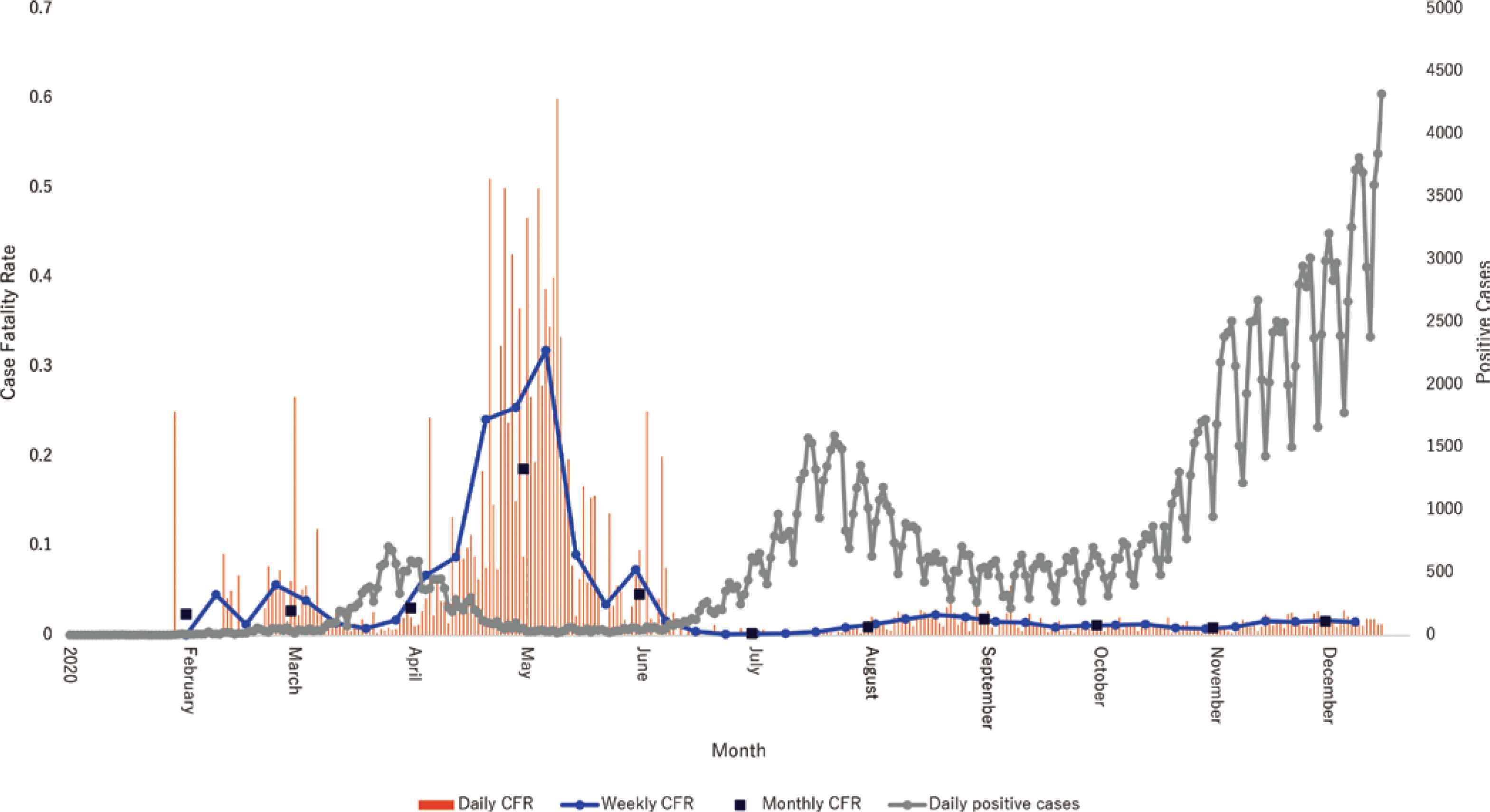 Case fatality rate and positive cases of COVID-19 in Japan, 2020.